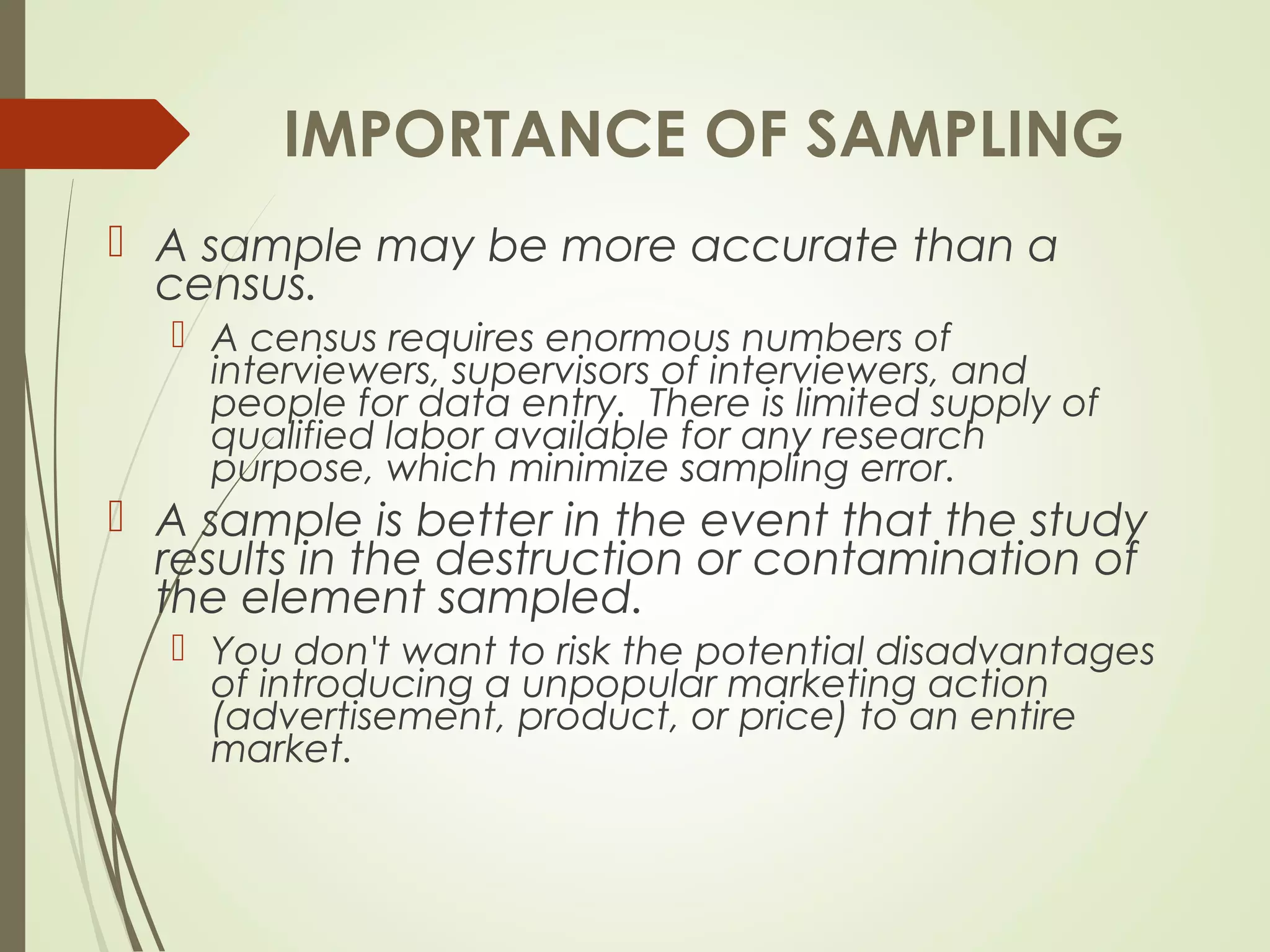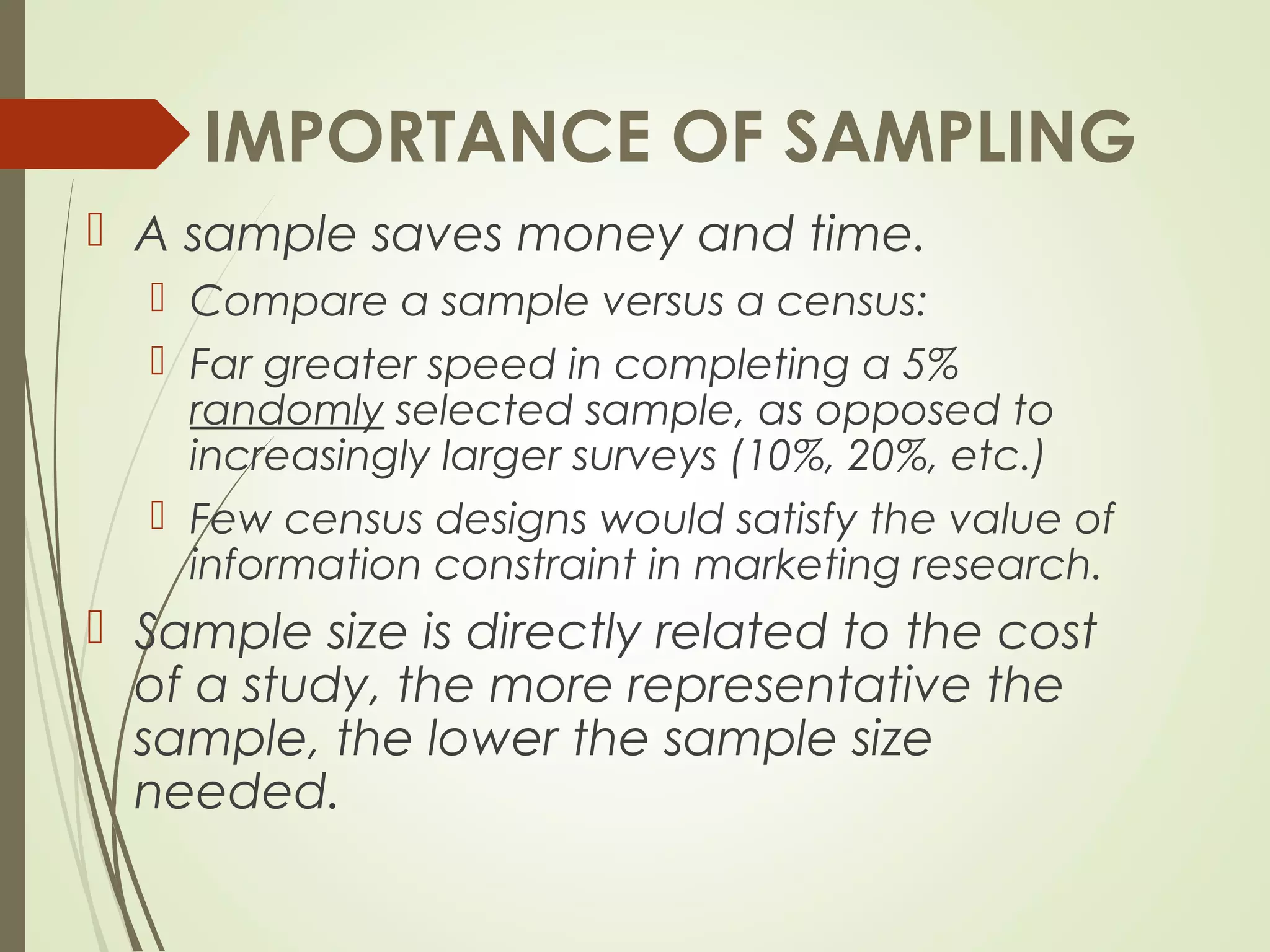 The document discusses the importance and benefits of sampling over a census for research purposes. It notes that sampling saves time and money compared to a census. Additionally, a sample may be more accurate than a census due to limitations in resources and risks of introducing unpopular actions to an entire market. The document also emphasizes that both sampling design and sample size are important considerations, as an inappropriate design will not allow findings to be generalized even with a large sample, and an inadequate sample size cannot meet study objectives. It provides some general guidelines for appropriate sample sizes.