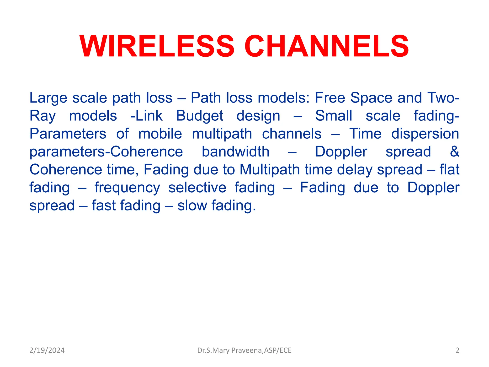 The document discusses the significance of wireless channels in communication, highlighting large-scale path loss, multipath fading, and different radio propagation models, such as free space and two-ray models. It explains the unique challenges of wireless systems including path variability, random signal behavior, and interference from other sources. Moreover, it emphasizes the impact of urban environments on signal propagation and the importance of understanding various fading mechanisms for efficient wireless communication design.