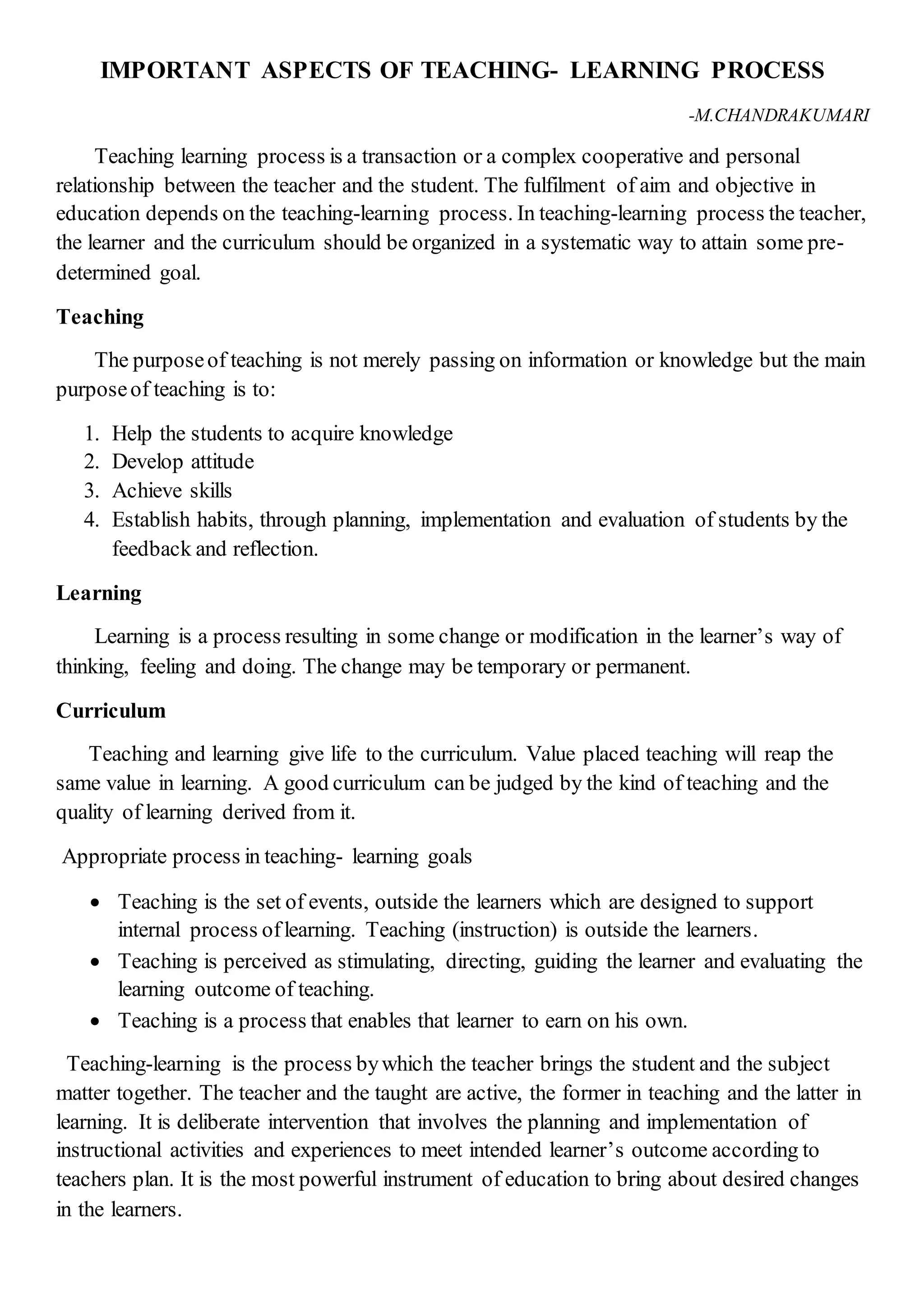 The document discusses important aspects of the teaching-learning process. It describes teaching-learning as a complex relationship between teacher and student, where the teacher helps students acquire knowledge, develop attitudes and skills. Learning is defined as a process that results in changes to a learner's thinking, feelings and actions. A good curriculum comes to life through effective teaching and quality learning. The teaching-learning process enables the teacher to bring students and subject matter together, with the teacher actively teaching and the student actively learning, to achieve intended outcomes.
