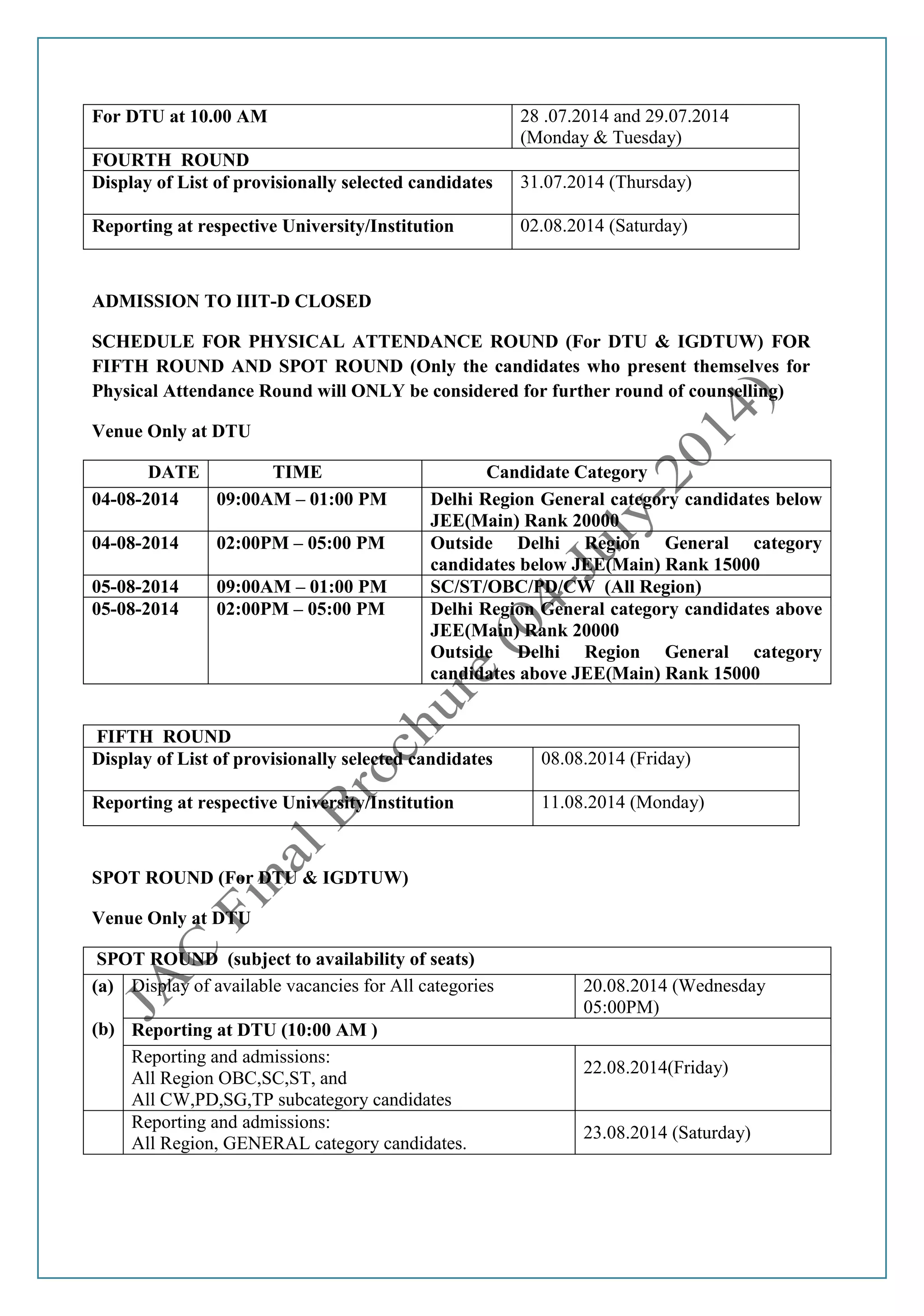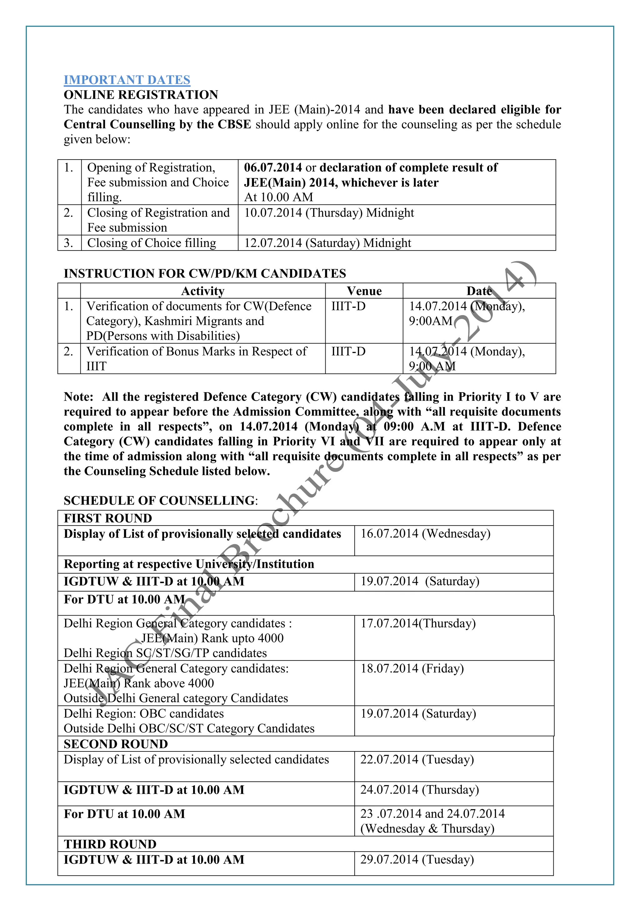 The document outlines important dates for the online registration and counseling process for JEE (Main)-2014. It provides the schedule for online registration from July 6th to July 10th. It also gives the dates for verification of documents on July 14th for certain candidate categories. The counseling schedule is divided into first, second, third and fourth rounds happening from July 16th to August 2nd. It concludes with the schedule for a physical attendance round and spot round from August 4th to 23rd for seats remaining at DTU and IGDTUW.