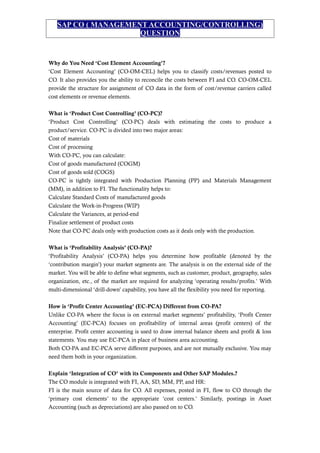 The document provides an overview of SAP's Controlling (CO) module, which handles management accounting and cost accounting functions. It describes key CO concepts like cost centers, controlling areas, cost elements, and how CO integrates and shares data with other SAP modules like FI, SD, MM, and PP. It also explains components of CO like cost center accounting, product cost controlling, and profitability analysis and how they are used.