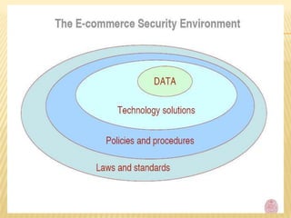 The document discusses security threats in e-commerce, including various types of malicious code, unwanted programs, phishing and identity theft, hacking and cybervandalism, credit card fraud, spoofing and spam websites, denial of service attacks, and other threats such as sniffing and insider jobs. It also outlines some technology solutions for protecting internet communications through encryption, securing communication channels, protecting networks with firewalls, and protecting servers and clients.