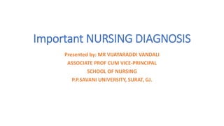 2. For diabetes, important diagnoses are knowledge deficit about managing the disease, risk for unstable blood sugar, risk for infection, and activity intolerance from hypo/hyperglycemia. Anxiety is also common.
