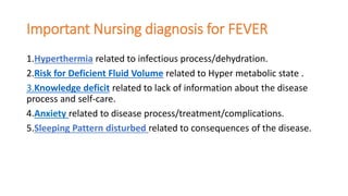 1. For fever, key diagnoses include hyperthermia, risk for dehydration, knowledge deficit about the disease, and anxiety. Sleep may also be disturbed.