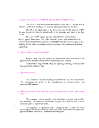 This document discusses the basics of microprocessors and the 8085 microprocessor. It begins with definitions of a microprocessor and its basic units. It then discusses multiplexing and how the 8085 demultiplexes address and data lines. It explains the functions of the IO/M, READY, HOLD and HLDA signals in the 8085. It defines flags and lists the flags in the 8085. It also defines terms like mnemonics, machine cycles, instruction cycles, fetch and execute cycles. It lists the machine cycles of the 8085 and explains the need for timing diagrams. It defines terms like T-state, opcode and operand. It discusses addressing modes in the 8085. It compares memory mapped I/