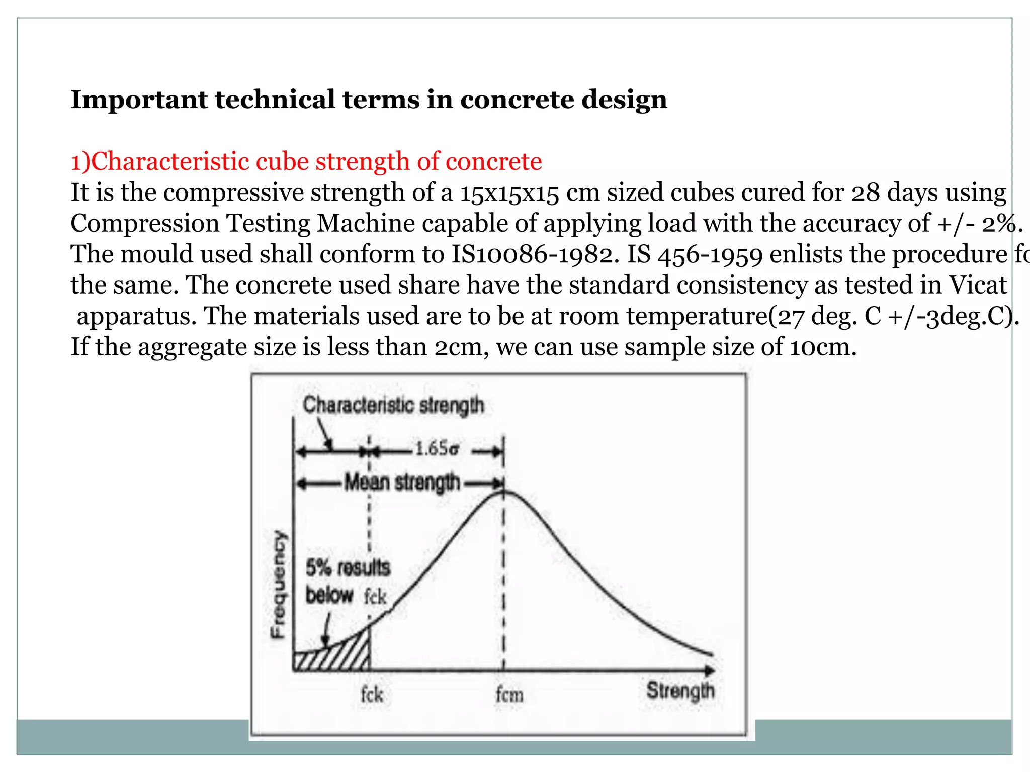 The document outlines essential technical terms in concrete design, including characteristic cube strength, universal testing machines, and tensile strength measurements. Key concepts such as curing methods, effective cover for steel reinforcement, and shear resistance calculations are also discussed, along with the importance of proper bond length and strength between bars and concrete. Additionally, it highlights various standards and procedures that govern concrete testing and structural integrity.