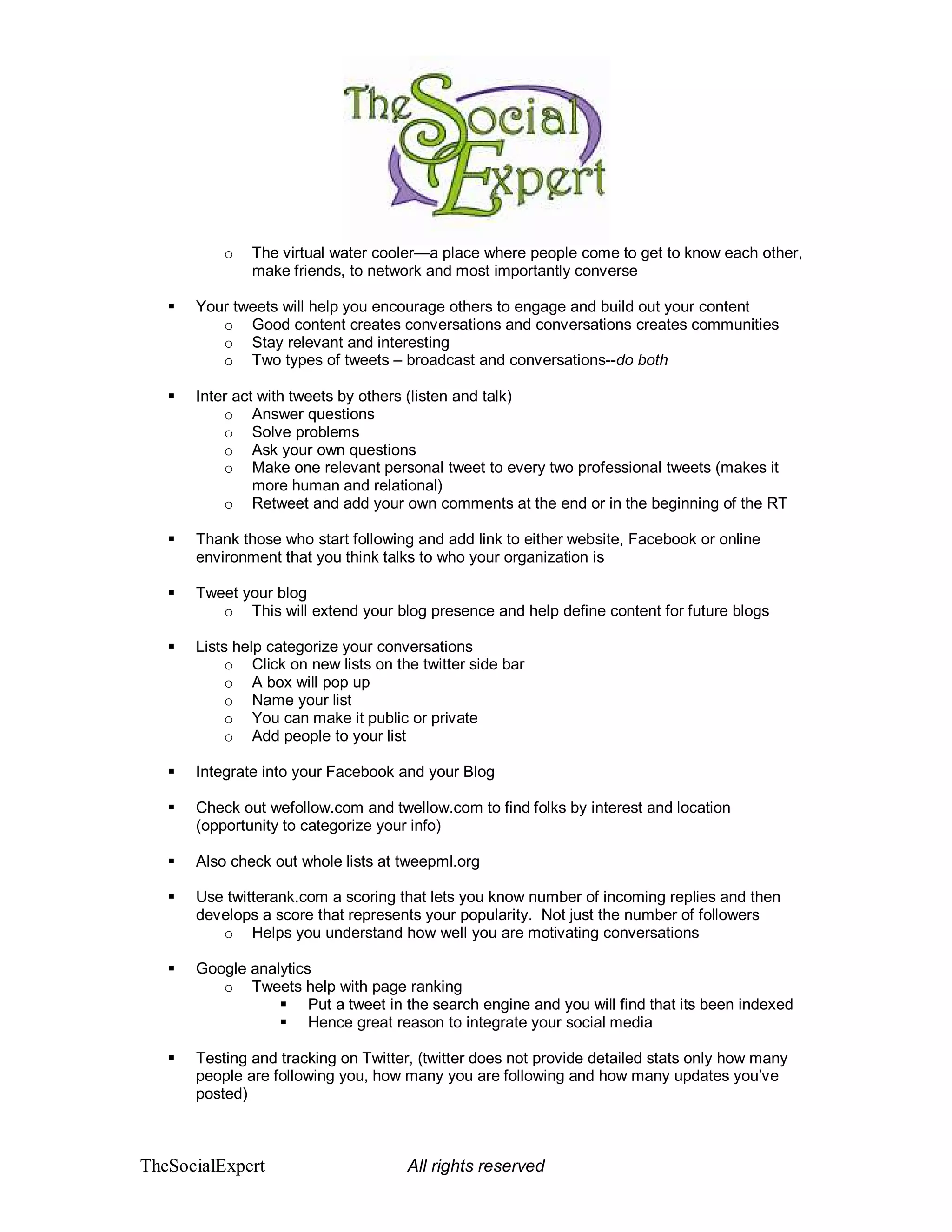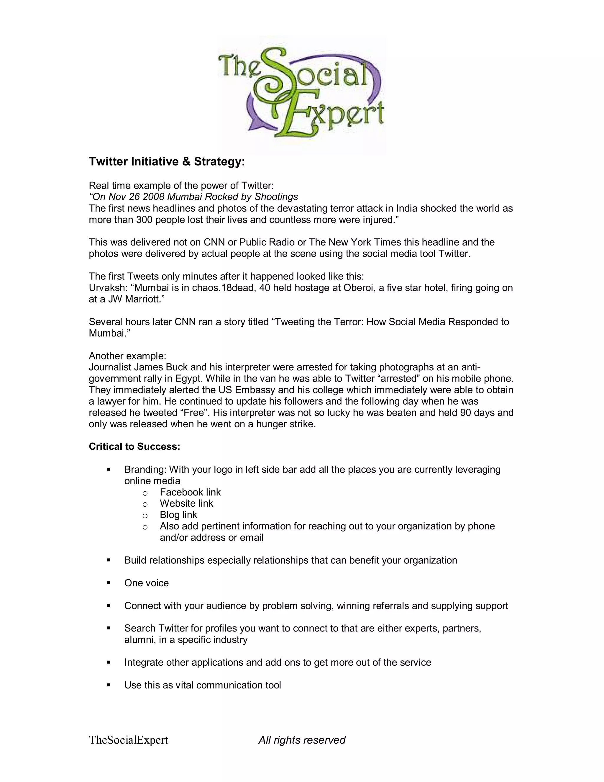 This document discusses strategies for using Twitter effectively. It provides examples of how Twitter was used to quickly spread news and updates during crises in Mumbai and Egypt. Key recommendations include branding your Twitter presence, building relationships, speaking with one voice, engaging your audience, integrating other apps, using Twitter to drive traffic to your website and blog, thanking new followers, and tracking your Twitter analytics. The advantages of effective Twitter use include extending your brand's reach, building deeper relationships, gaining expert advice, and driving users to your other online environments.