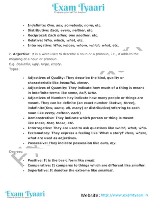 The document summarizes the main parts of speech in English grammar - nouns, pronouns, adjectives, verbs, adverbs, prepositions, conjunctions and interjections. It provides definitions and examples of each part of speech and their types. It also discusses the four types of sentences and rules for subject-verb agreement. The parts of speech and rules of grammar are foundational aspects of the English language.