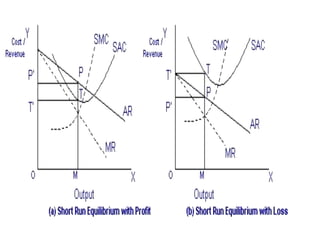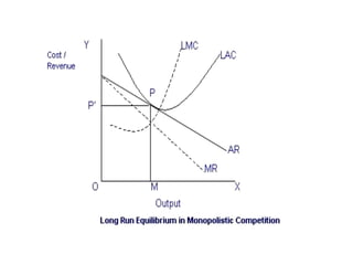 Imperfect competition refers to market situations between perfect competition and monopoly, characterized by firms having some price control and facing downward-sloping demand curves. Key features include product differentiation, large numbers of firms, and non-price competition, with specific classifications such as monopolistic competition and oligopoly. The document also discusses profit maximization strategies for monopolists and outlines concepts such as deadweight loss and collusion within an oligopolistic market.