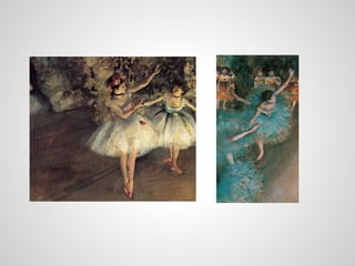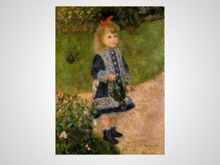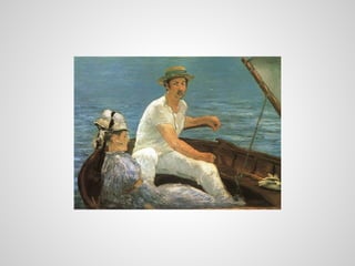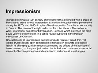 Impressionism was a 19th century art movement known for relatively small, thin brush strokes; an emphasis on light and accurate depiction of changing light effects; common subject matter; inclusion of movement; and unusual angles. Impressionist paintings used short, thick strokes of unmixed paint applied side-by-side to create vibrant colors, with grays produced using complements and an avoidance of black paint. They emphasized the play of natural light and reflection of colors across objects, often painting outdoors to capture fresh shadows and evening effects.