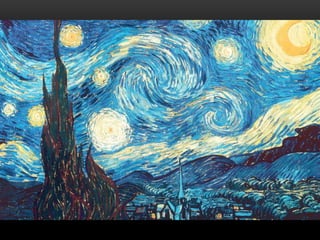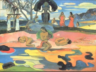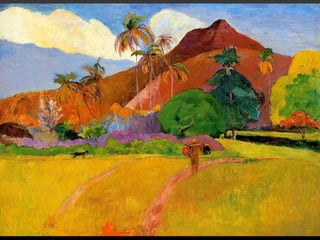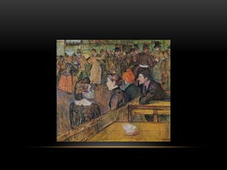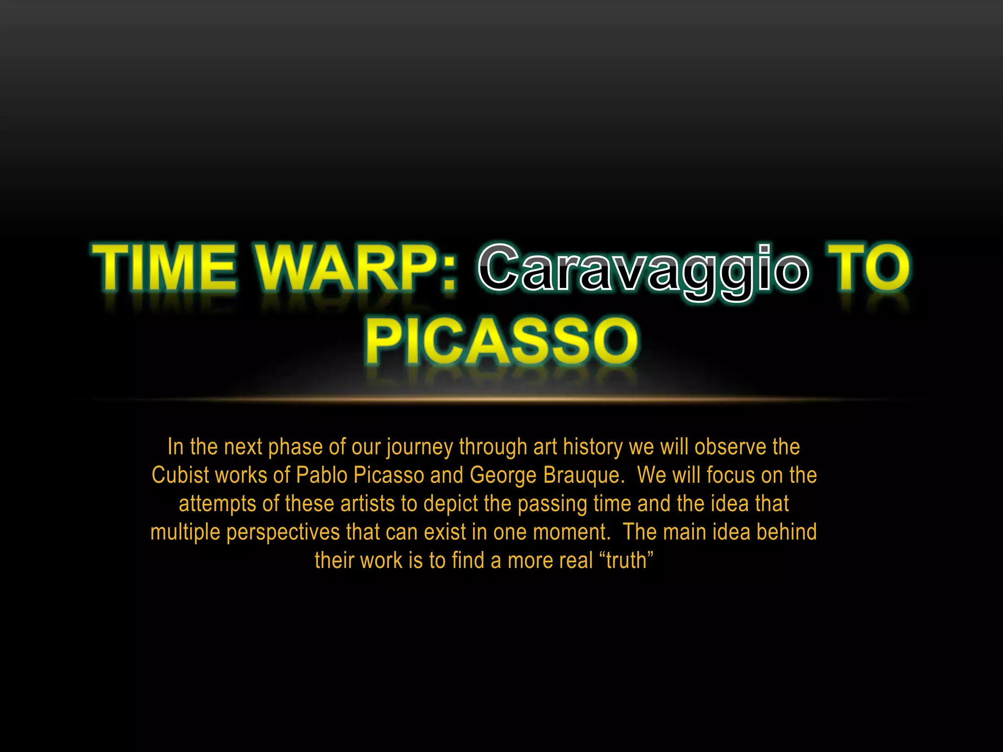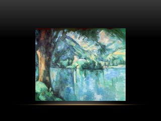 The document discusses Cubist works by Pablo Picasso and George Braque that focused on depicting multiple perspectives and a more realistic "truth" that can exist in a single moment. It focuses on how Impressionist artists like Claude Monet painted fleeting moments using light, color, and brushstrokes to illustrate the passing of time. Post-Impressionism expanded on these techniques, allowing more experimentation and personal expression through compositions, colors, and techniques like cropping by artists such as Van Gogh, Toulouse-Lautrec, Cezanne, Gauguin, and Degas.