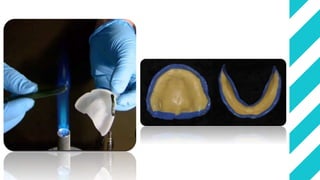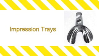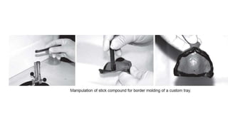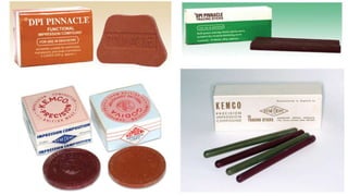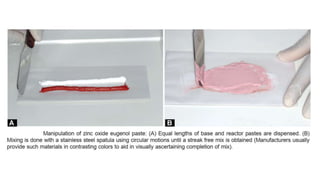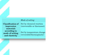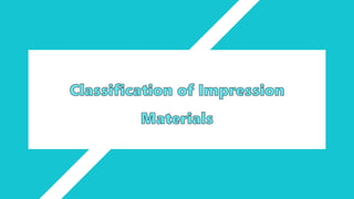 Dental impression materials are used to create negative replicas of oral structures that are then used to produce positive models. There are several types of impression materials classified by their setting properties and uses. Alginate is the most commonly used elastic impression material due to its ease of use and ability to accurately capture detail. It works well for impressions in mouths with undercuts or excess saliva. Alginate must be mixed properly and used within a short working time to achieve accurate impressions. Rigid materials like impression compound and zinc oxide eugenol paste are suitable for edentulous impressions where reproduction of fine details is not essential.