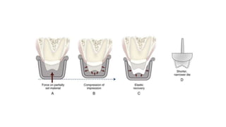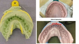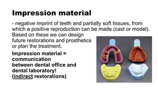 The document discusses impression materials used in dentistry, defining them as tools for creating negative imprints of teeth and soft tissues to produce positive reproductions for restorations and prosthetics. It details various types of impression materials, their applications, properties, and methods of use in diagnostic models, bite registration, and treatment planning across different dental disciplines. The importance of proper handling, dimensional stability, and compatibility with other materials is emphasized, along with the classification of the materials based on their characteristics and the specific techniques used for making impressions.