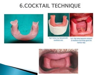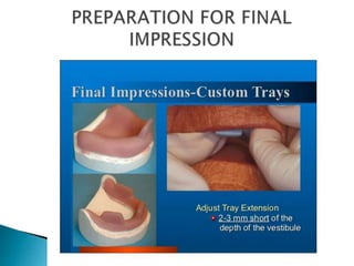 The document covers various aspects of impression making in dentistry, including definitions, techniques, and materials used. It details the differences between preliminary and final impressions, as well as different impression techniques such as mucostatic and mucocompressive. Additionally, it discusses the management of compromised situations and provides insights into patient care and the importance of various impression materials.