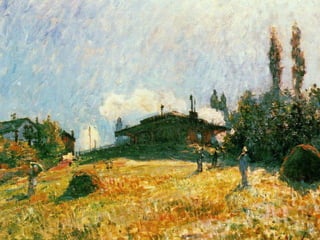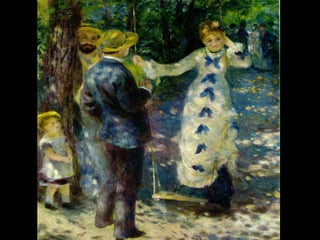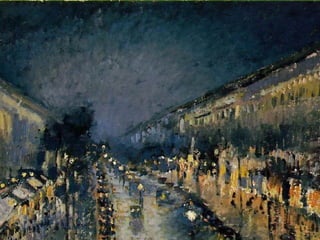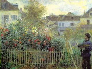 Impressionism was an art movement that began in the 1860s with loose associations of Paris-based artists who felt photography was diminishing painting. They developed a new style focused on capturing the sensation of viewing a subject rather than precise rendering. Characteristics included visible brushstrokes, light colors, emphasis on light and its changing qualities, ordinary subjects, unusual angles, and open compositions. While initially disliked, impressionist works came to be seen as capturing a fresh vision. Major impressionist artists included Monet, Renoir, Degas, Pissarro, and Sisley.