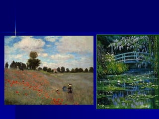 Edouard Manet (1 832-1883) El més poètic dels pintors impressionistes; la seva principal aportació és la sensibilitat i la seva voluntat de captar les formes que canvien contínuament. En les sèries de variacions d’un mateix tema: El Parlament de Londres , La Catedral de Rouen ( FITXA 140 ) , Les Nimfees ..., experimenta els efectes de la llum en diferents hores del dia i en diverses condicions atmosfèriques ; no pretén fixar el que és, sinó plasmar el que canvia. Són composicions planes, sense perspectiva . Preocupat pels efectes estètics de la combinació de colors , realitza un art essencialment decoratiu . Pinta atmosferes més que objectes, i sobrepassa la simple figuració. En les seves sèries, Monet obre el camí de la investigació cap a l’art abstracte . Kandinsky va aprendre de Monet que la forma i el color expressen emocions per sí mateixos . Va pintar més de 3.000 quadres, sobretot paisatges, marines i escenes fluvials. Destaquen les Regates d'Argenteuil , on capta, mitjançant pinzellades ràpides i soltes, els reflexos lluminosos de l’aigua.