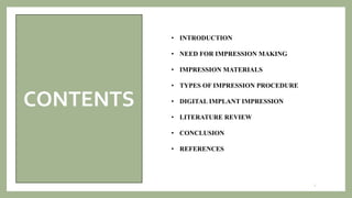 This document provides an overview of implant impressions presented by Dr. Vaishali Shrivastava. It discusses the need for accurate implant impressions, common impression materials and techniques. Conventional impression techniques include closed and open tray methods. Digital implant impressions using intraoral scanners are also described. The advantages and disadvantages of different techniques are reviewed. Several studies comparing the accuracy of impression materials and techniques are summarized. Overall, the review found no significant differences between open and closed tray techniques, but open tray may be more accurate for non-parallel implants. Digital impressions provided more accurate results than conventional methods in some studies.