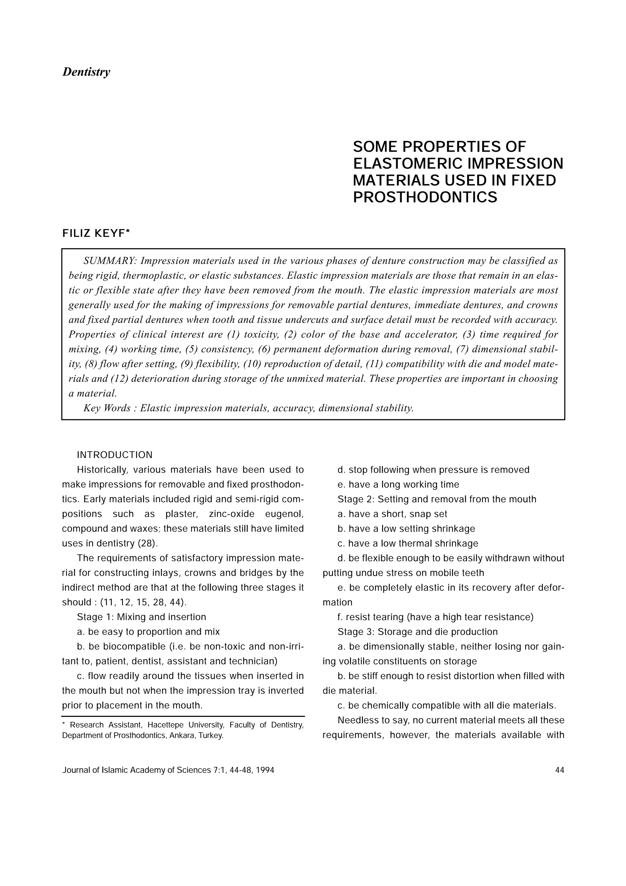 The document discusses elastic impression materials used in dentistry. It describes the key properties impression materials should have, including being non-toxic, dimensionally stable, and accurately reproducing detail. The main types of elastic impression materials are discussed - addition silicone, condensation silicone, polysulfide, and polyether. Each have advantages and disadvantages regarding properties like accuracy, detail reproduction, setting time, flexibility and dimensional stability. Polyether and addition silicone generally demonstrate the best accuracy and stability over time.