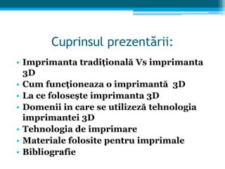 Documentul prezintă o comparație între imprimantele tradiționale și cele 3D, evidențiind cum imprimantele 3D utilizează un proces de adăugare strat cu strat pentru a crea obiecte tridimensionale. Acesta descrie funcționarea, utilizările și tehnologiile de imprimare 3D, precum și materialele folosite, cum ar fi plasticele și rășinile. Imprimarea 3D găsește aplicații în diverse domenii, inclusiv arhitectură, industrie, arheologie, criminalistică și medicină, oferind avantaje semnificative în prototipizare și producție rapidă.