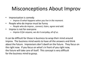 This document discusses how improvisation techniques can be applied in business settings. It begins by addressing common misconceptions about improv, noting that improv is about living in the moment rather than just comedy. It then discusses how improv focuses on listening, agreeing, and building on others' ideas rather than dwelling on the future. The document provides examples of how major companies like Twitter and Spanx have used improv training to create more collaborative cultures. It outlines several basic improv tools like connecting, listening, agreeing and adding on to ideas that can improve communication and creativity in the workplace. Press coverage is cited that has praised how improv can help create a culture of openness and new idea generation in businesses.