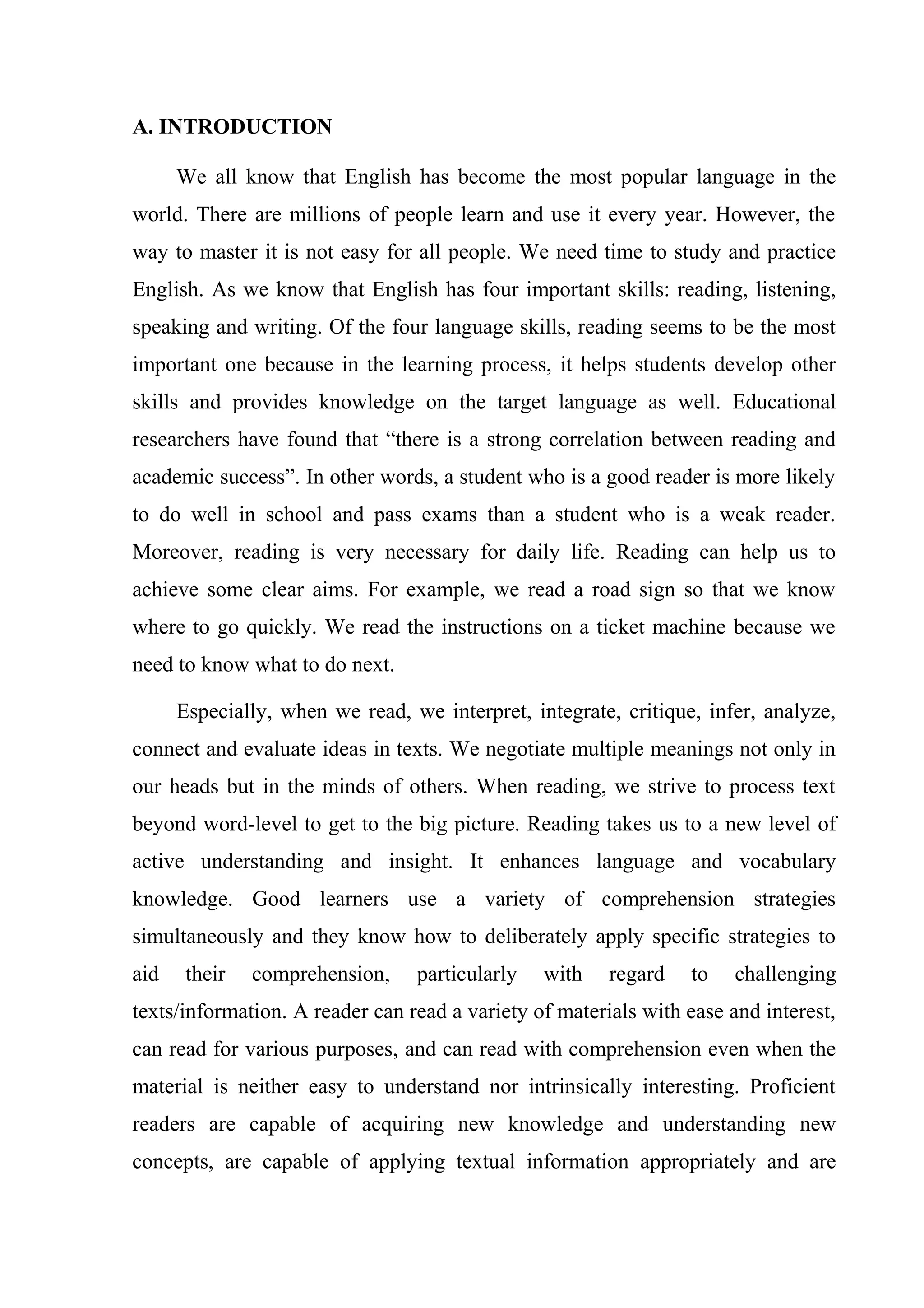 The document discusses strategies for improving reading skills. It defines reading as a complex process involving comprehension. Some key strategies discussed include identifying reading purposes, finding helpful materials, using suitable reading styles like skimming and scanning, following instructions carefully, and increasing reading speed. The document emphasizes practicing extensive reading from a variety of sources to develop vocabulary and background knowledge for better reading comprehension.