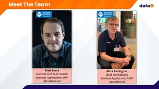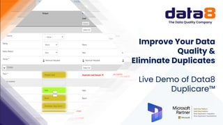 Data8 provides data quality and duplicate detection solutions including Data8 DuplicareTM. A live demo will showcase how Data8 DuplicareTM helps improve data quality and eliminate duplicates in Microsoft Dynamics 365. The presentation will introduce the Data8 team, solutions, global clients, and processing volumes. It will also cover a demonstration of Data8 DuplicareTM capabilities for duplicate detection, merging records, and pricing models.