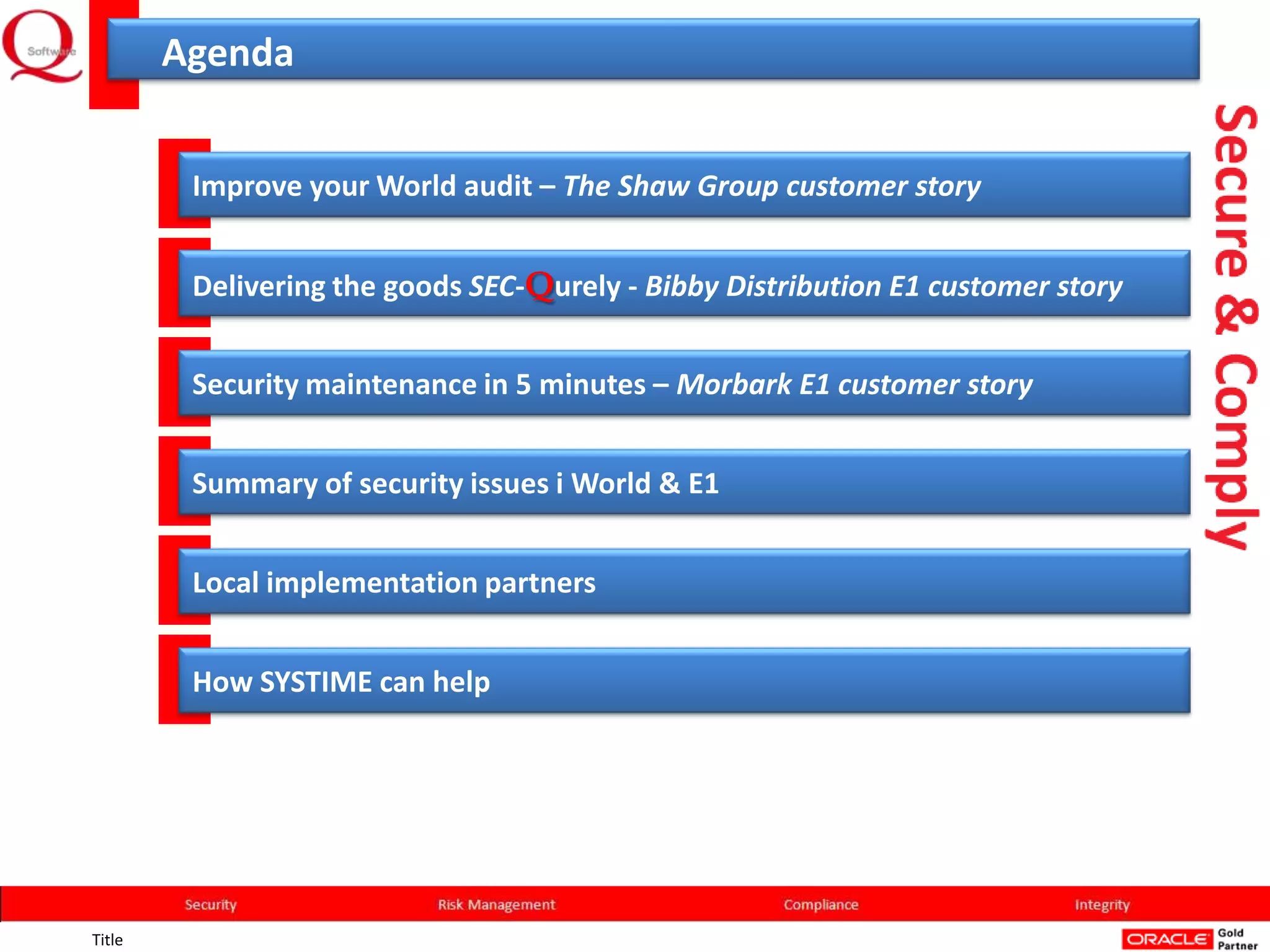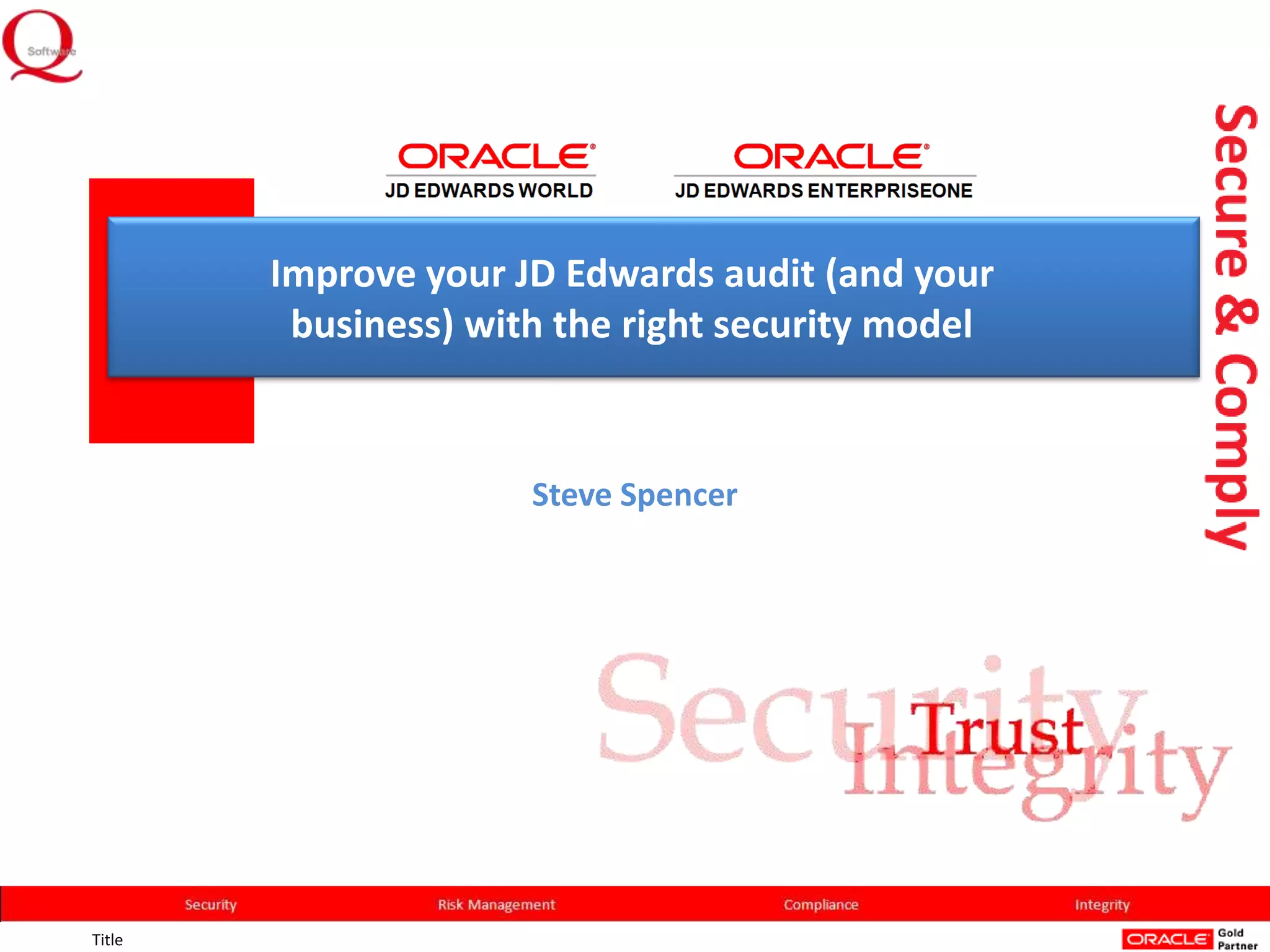 This document discusses improving JD Edwards security and audit processes. It summarizes three customer case studies where the company SYSTIME helped customers implement tighter security models in their JD Edwards World or EnterpriseOne systems. This reduced the effort of managing security to only 5 minutes in some cases. It also improved audit processes by making compliance and reporting on security controls much easier. SYSTIME's software solutions helped customers address common security issues and pass audits with minimal effort.