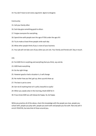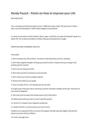 Randy Pausch wrote a letter to his family before dying of pancreatic cancer with advice on improving life. He advised focusing on positivity, not comparing oneself to others, forgiving others, spending time with family and friends, and putting faith in God. Pausch hoped sharing this advice would enrich both the lives of his loved ones and those around them.