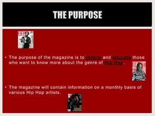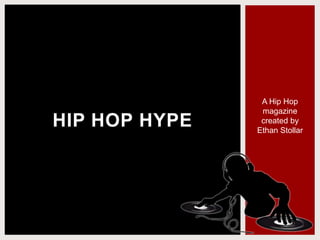 The document outlines plans for a new hip hop magazine called "HIP HOP HYPE" created by Ethan Stollar. The magazine will have both print and online versions, be 80-100 pages long, and focus on hip hop artists based in North London. It will target males and females aged 16-21 in North London through social media advertising. The magazine hopes to partner with local artists and venues to generate revenue and provide giveaways to subscribers.