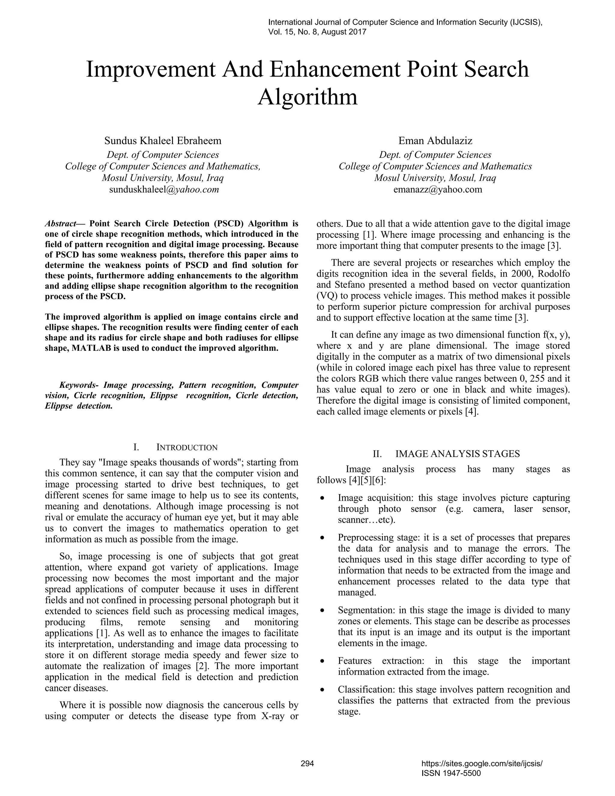 The paper discusses an enhancement of the Point Search Circle Detection (PSCD) algorithm, addressing its weaknesses and improving its capabilities for recognizing both circles and ellipses. By utilizing techniques such as midpoint algorithms and accurate inspection point determination, the improved algorithm demonstrates greater efficiency and accuracy in shape recognition through digital image processing. The study includes results from MATLAB applications and concludes with the potential uses of the algorithm in various fields, including medical applications.