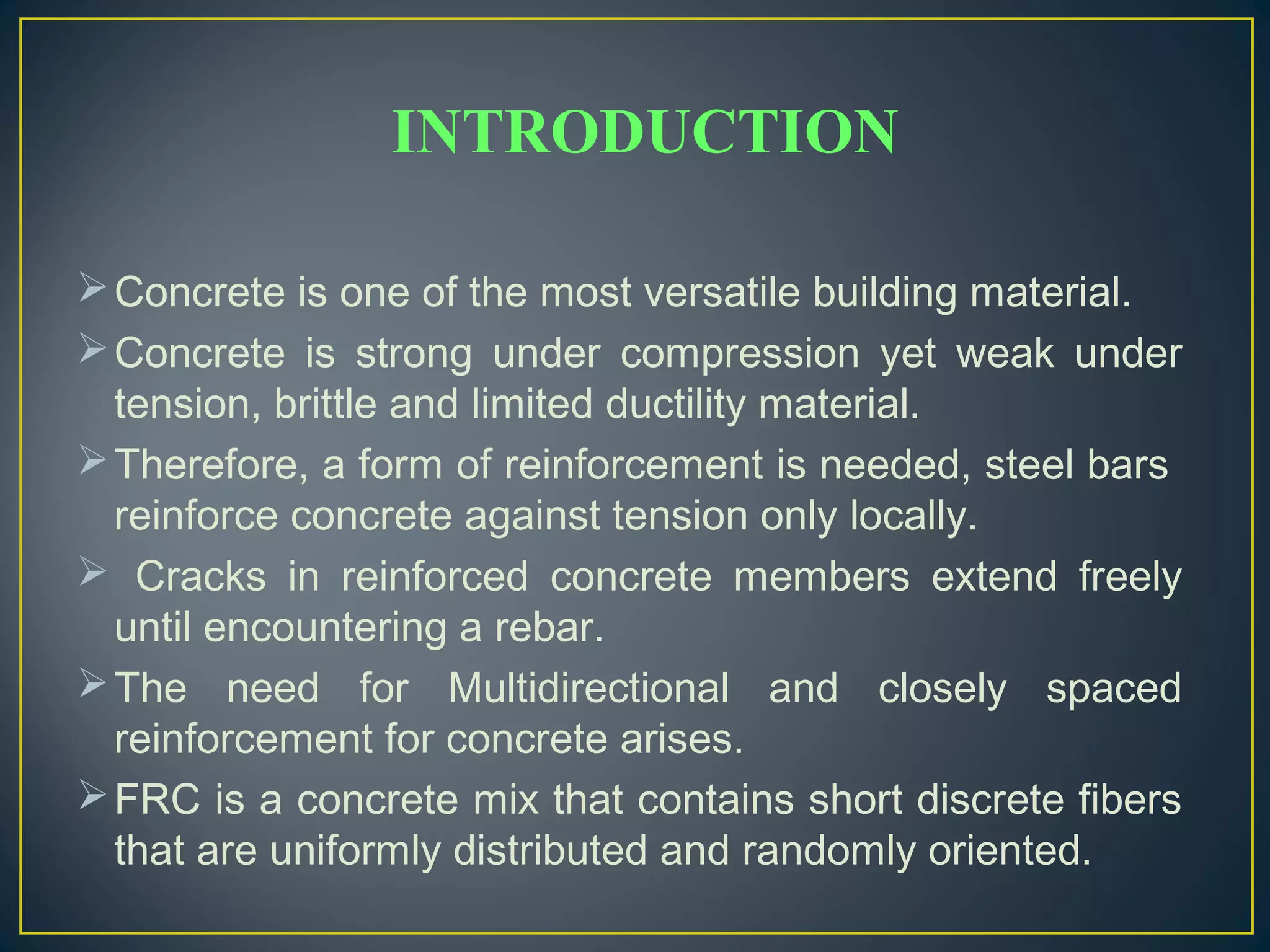 This document discusses a study on improving the properties of concrete by adding fibers. It summarizes that concrete is strong in compression but weak in tension. It then discusses different types of fibers that can be added like steel fibers, polypropylene fibers, carbon fibers, and glass fibers. The study focuses on adding steel fibers and polypropylene fibers to concrete mixtures to test their effect on compressive and tensile strength. The results showed that mixtures with both steel and polypropylene fibers had higher strengths compared to plain concrete at 7 and 28 days. Applications of fiber reinforced concrete included industrial floors, building structures, tunnels and more.