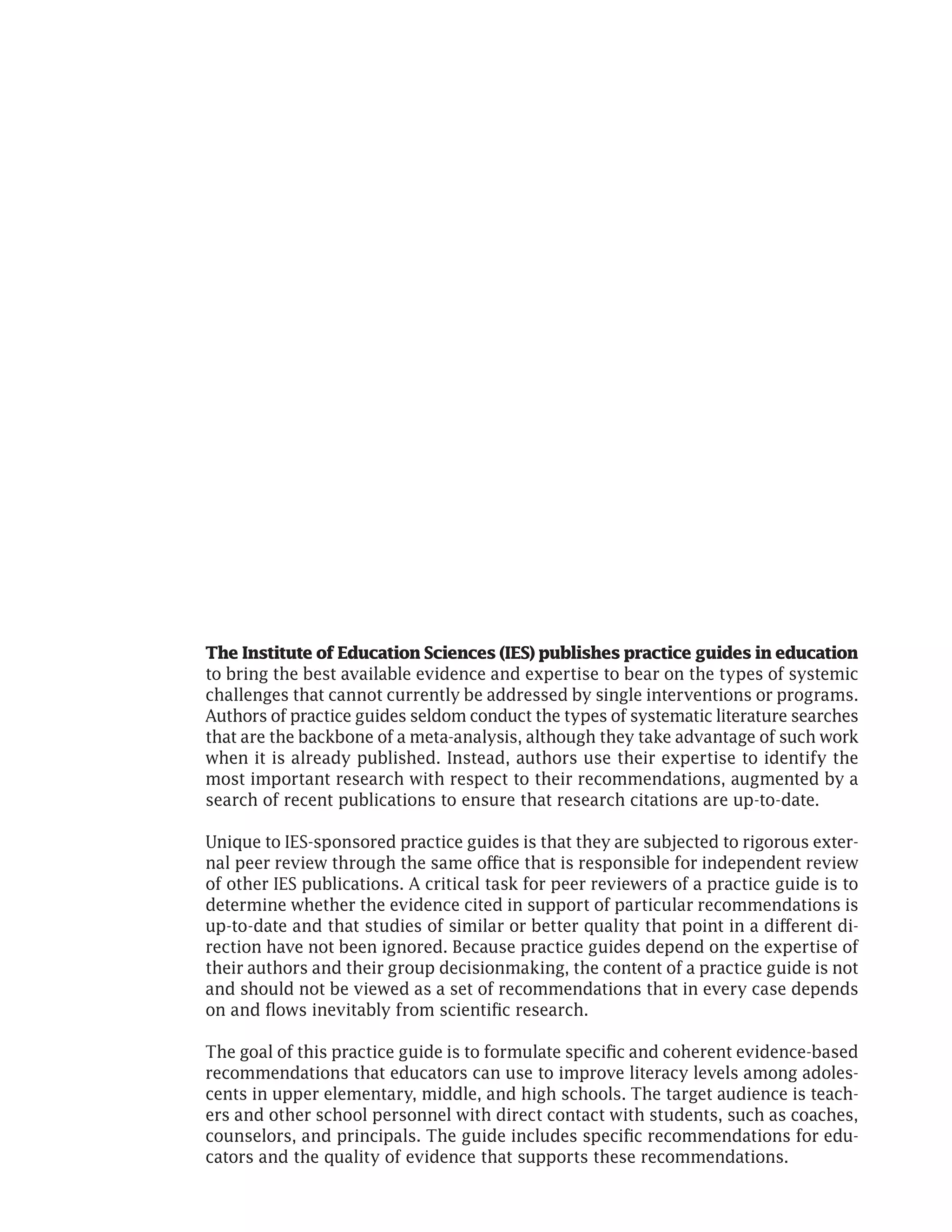 This document presents recommendations for improving adolescent literacy based on an analysis of research evidence. It aims to provide teachers and other school staff with practical strategies supported by various studies. The recommendations target students in upper elementary through high school. They address vocabulary instruction, comprehension strategies, discussion of texts, increasing student motivation and engagement, and interventions for struggling readers. Each recommendation is accompanied by a discussion of the strength of the evidence backing it, which can be strong, moderate, or low. The goal is to help educators select practices that have the best chance of boosting literacy skills.