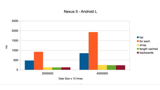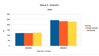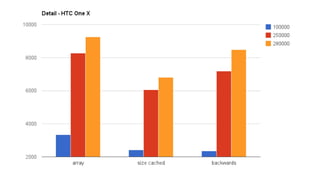 The document provides an overview of improving Android performance by discussing Java virtual machines, examples of code optimizations and anti-patterns, and tools for measuring and optimizing performance. It covers topics like avoiding autoboxing when possible, using arrays over lists for loops, caching array lengths, and using StringBuilder instead of string concatenation. Tooling discussed includes using a disassembler to view bytecode, code obfuscation with Proguard, and best practices for performance measurement.