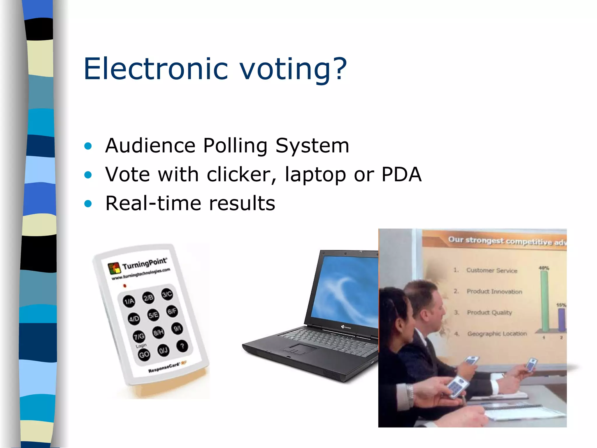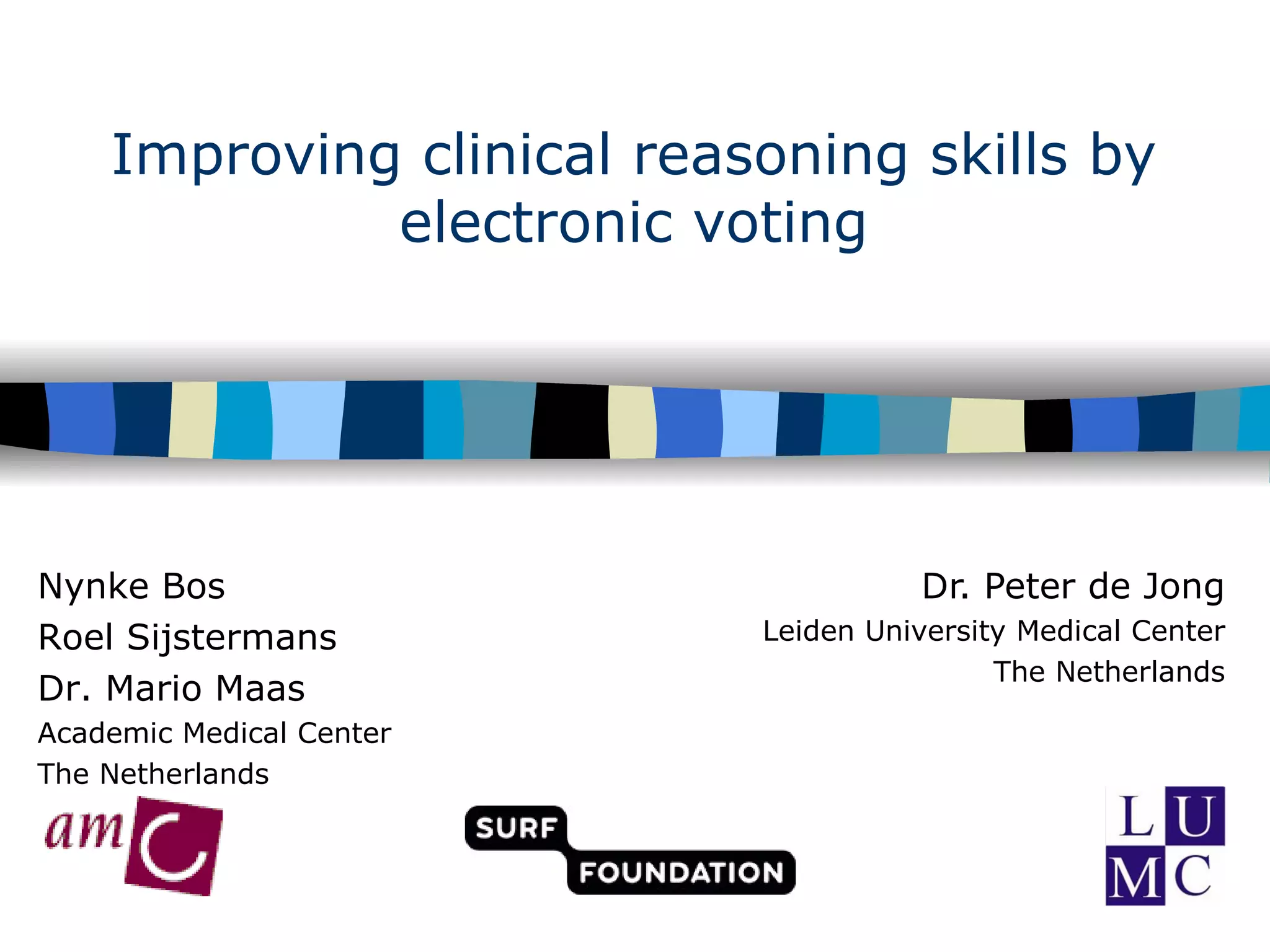 The document discusses the use of electronic voting (clickers) in enhancing clinical reasoning skills among medical students at two universities in the Netherlands. By implementing real-time audience polling during lectures, instructors can evaluate and adapt to students' knowledge levels while also facilitating interactive learning through multimedia clinical cases. Overall, the program aims to improve student engagement and clinical reasoning capabilities while reducing logistical challenges in traditional learning environments.