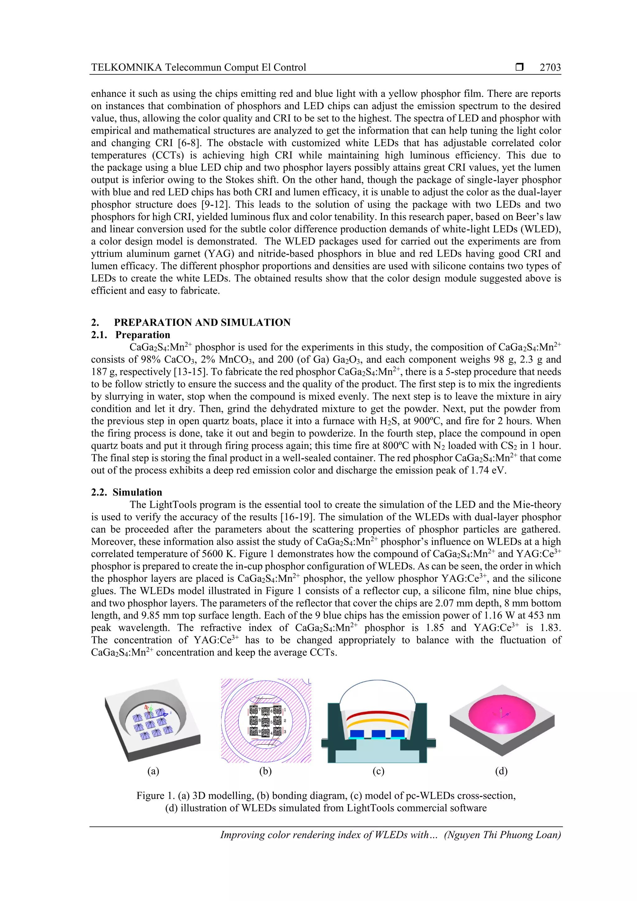 This document summarizes a study that aimed to improve the color rendering index (CRI) of white-light LEDs (WLEDs) using a dual-layer remote phosphor configuration with red-emitting CaGa2S4:Mn2+ phosphor. The study used a simulation model to analyze different phosphor proportions and densities in a package with two LED chips and dual phosphor layers. The results showed that CRI and color quality scale values increased with higher concentrations of CaGa2S4:Mn2+ phosphor. Specifically, CRI values increased from 2% to 24% concentration of the red phosphor. The study provides a method for customizing WLED modules to achieve high C