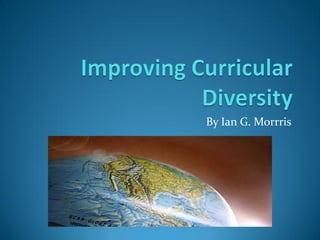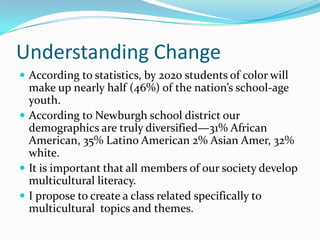 The document discusses the need for a new "Culture and Diversity" class at a school district where students of color will soon make up nearly half of youth. It notes the district's diverse demographics and importance of multicultural literacy. A new class is proposed to specifically address multicultural topics, which could motivate other teachers to implement more diversity and help shape a consensus celebrating the school's multicultural atmosphere by having a required course highlighting diversity.