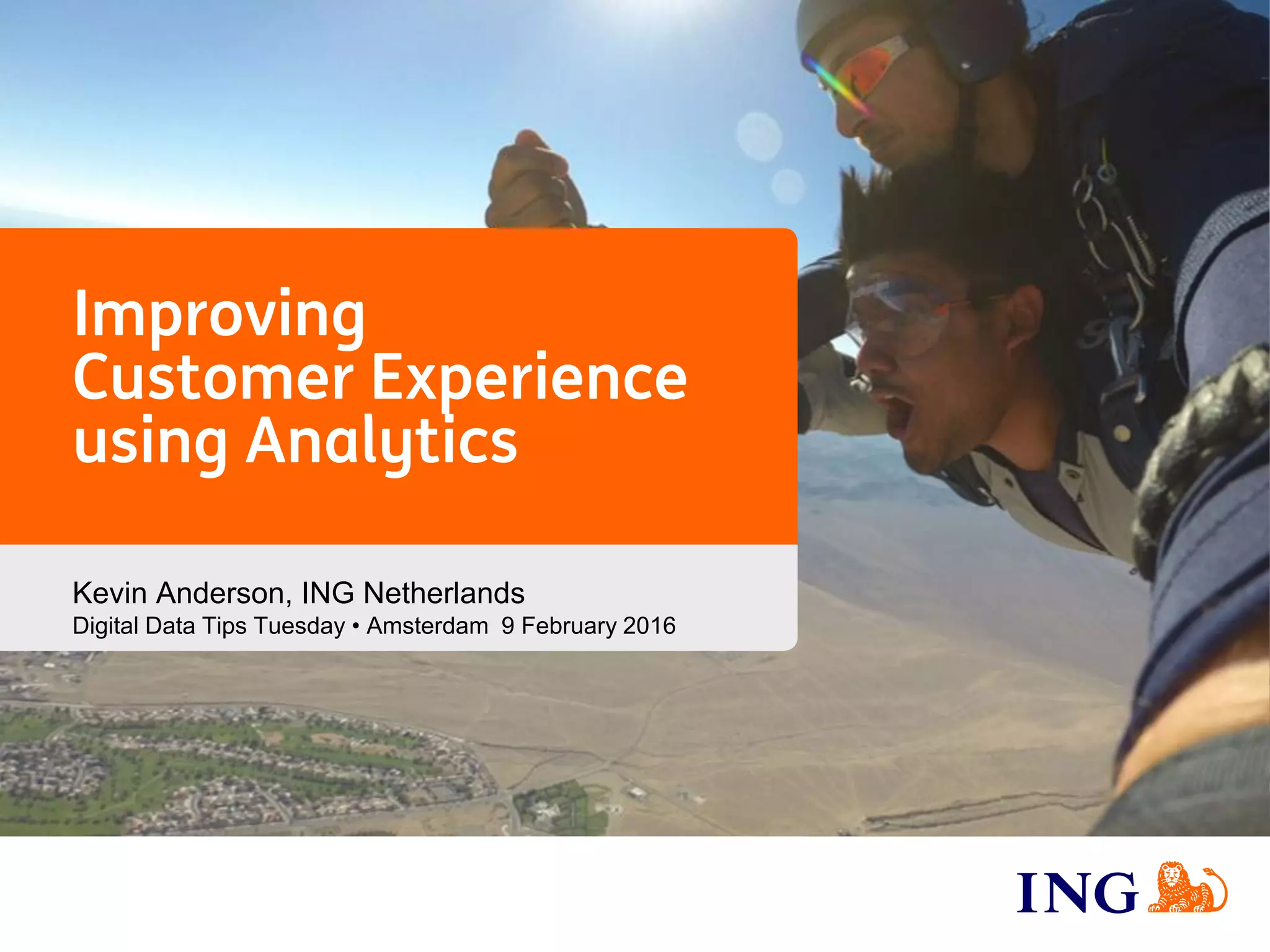 This document discusses how ING Netherlands uses analytics to improve customer experience. It highlights that ING has many digital touchpoints with customers, including high rates of internet banking and mobile phone usage. ING uses a "Customer Experience Improvement Cycle" approach involving metrics like Customer Effort Score and Net Promoter Score to continuously test, analyze and improve the customer experience across channels. ING's team of 55 data analysts work with tools like tag management, personalization, and A/B testing to drive experiments that reduce customer confusion and unnecessary switching between channels. This has resulted in improved Net Promoter Scores. The presentation encourages becoming a data analyst to help organizations better understand and influence customer behavior through insights and analysis.