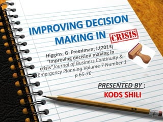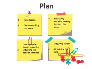 1. The document discusses improving decision making during crises by leveraging human strengths, mitigating decision derailers, and taking mitigating actions.