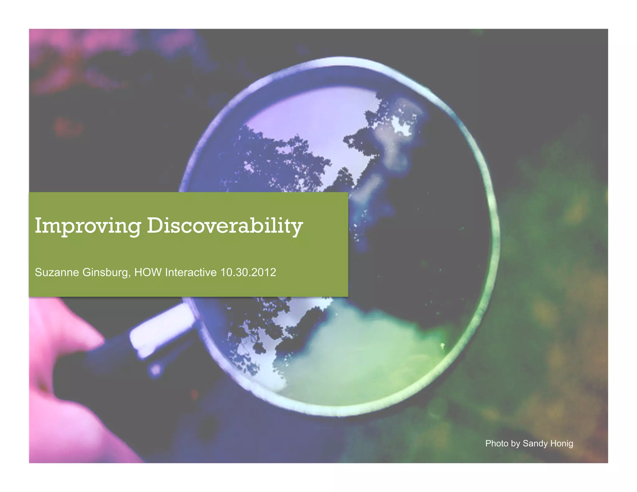 The document discusses the concept of discoverability in software, which refers to how easily users can find features and manage tasks within an application. It highlights the importance of discoverability for user satisfaction and cost reduction, providing tips such as leveraging mental models, offering contextual focus, and utilizing just-in-time content. Overall, the document emphasizes that good discoverability contributes to good design.