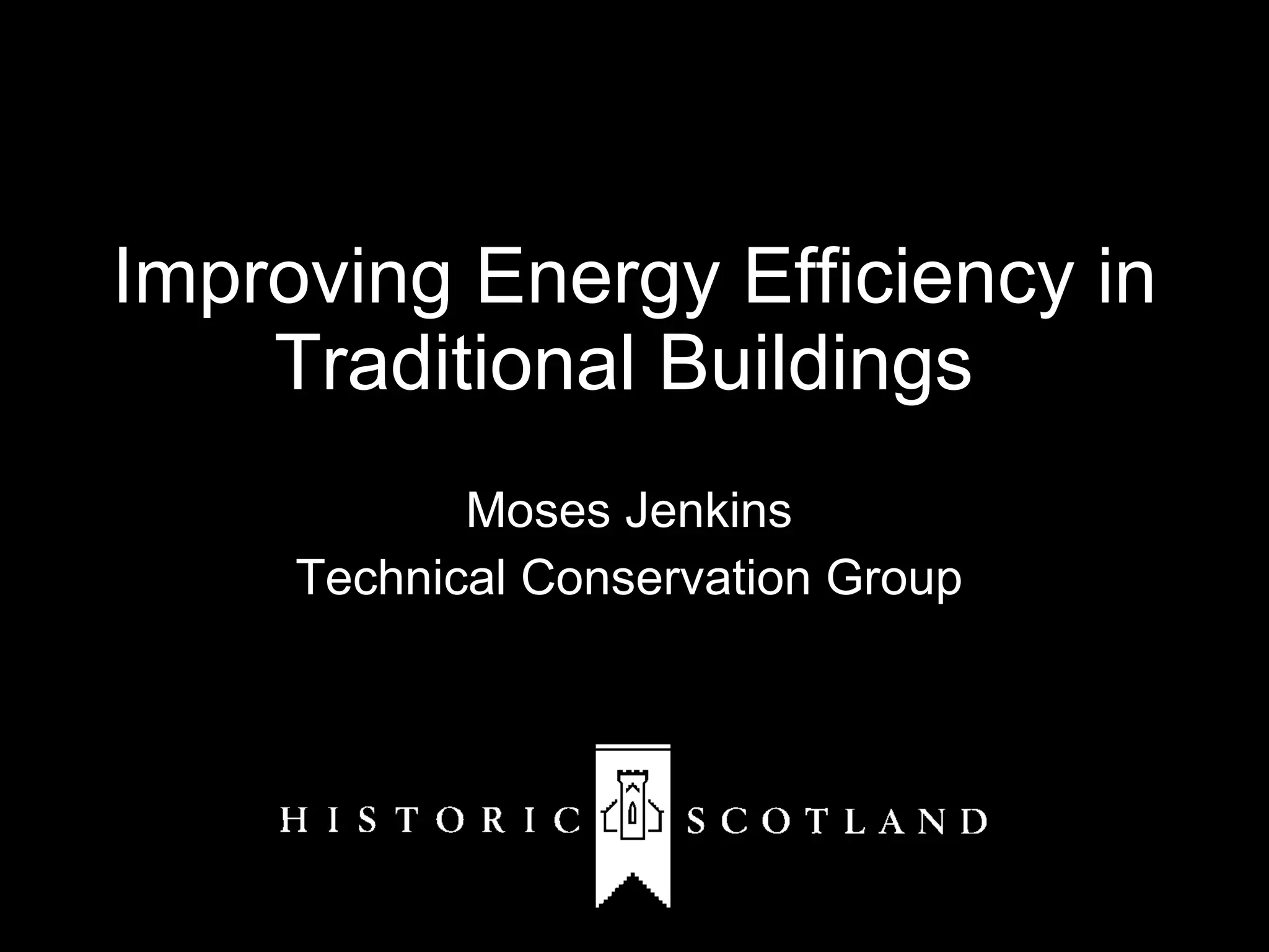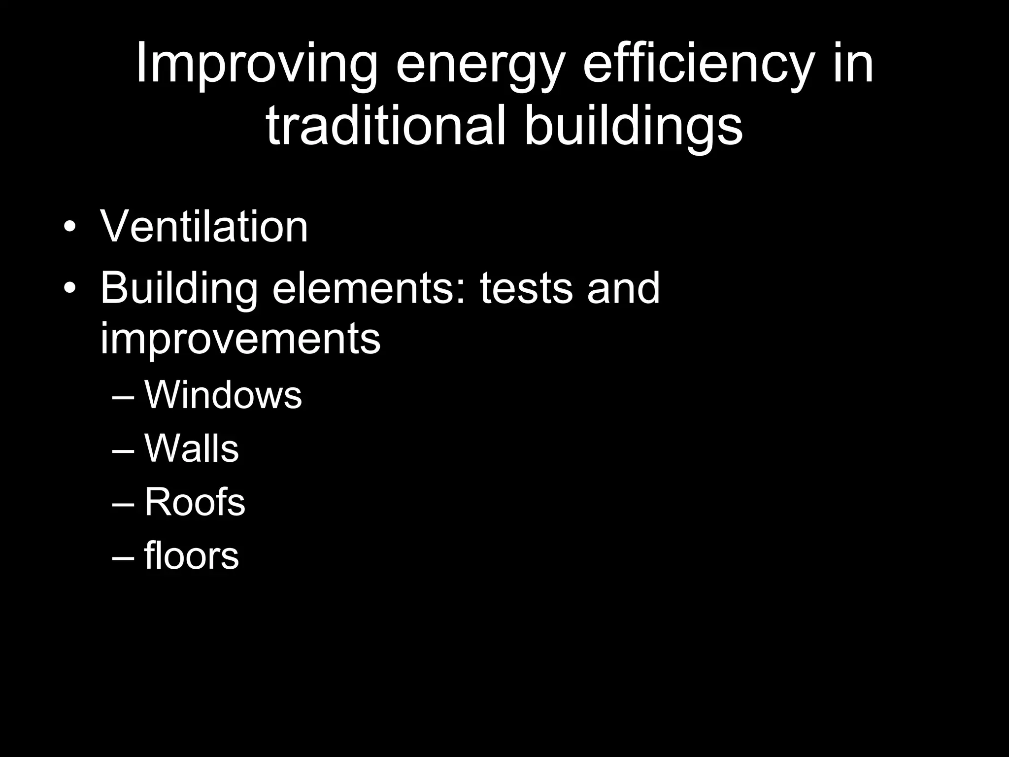 The document discusses methods to improve energy efficiency in traditional buildings, emphasizing the careful treatment of existing structures. It explores various building elements, such as windows, walls, and floors, and presents specific adaptation techniques like the use of improved shutters, secondary glazing, and insulation materials. The analysis includes various u-values and examples of effective interventions to enhance thermal performance without compromising traditional aesthetics.