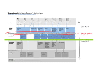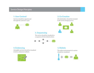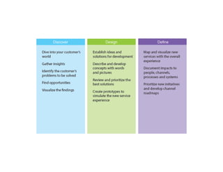 The document discusses the importance and methodology of service design as a means to enhance customer experiences by analyzing touchpoints and internal processes. It emphasizes understanding user needs through research and data analysis, creating journey maps and service blueprints to identify pain points and opportunities for improvement. Collaborative workshops and iterative prototyping are highlighted as key steps in developing effective service experiences that resonate with users.