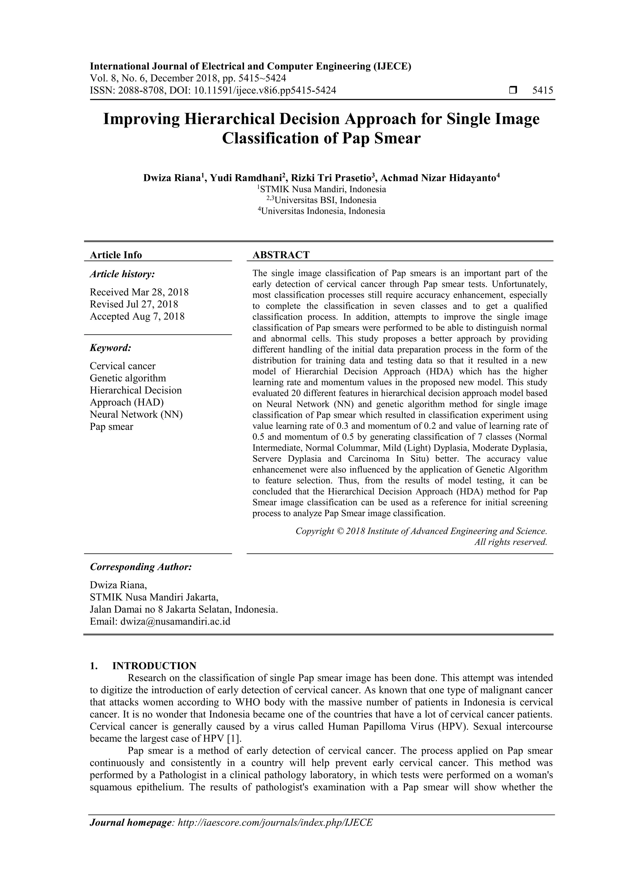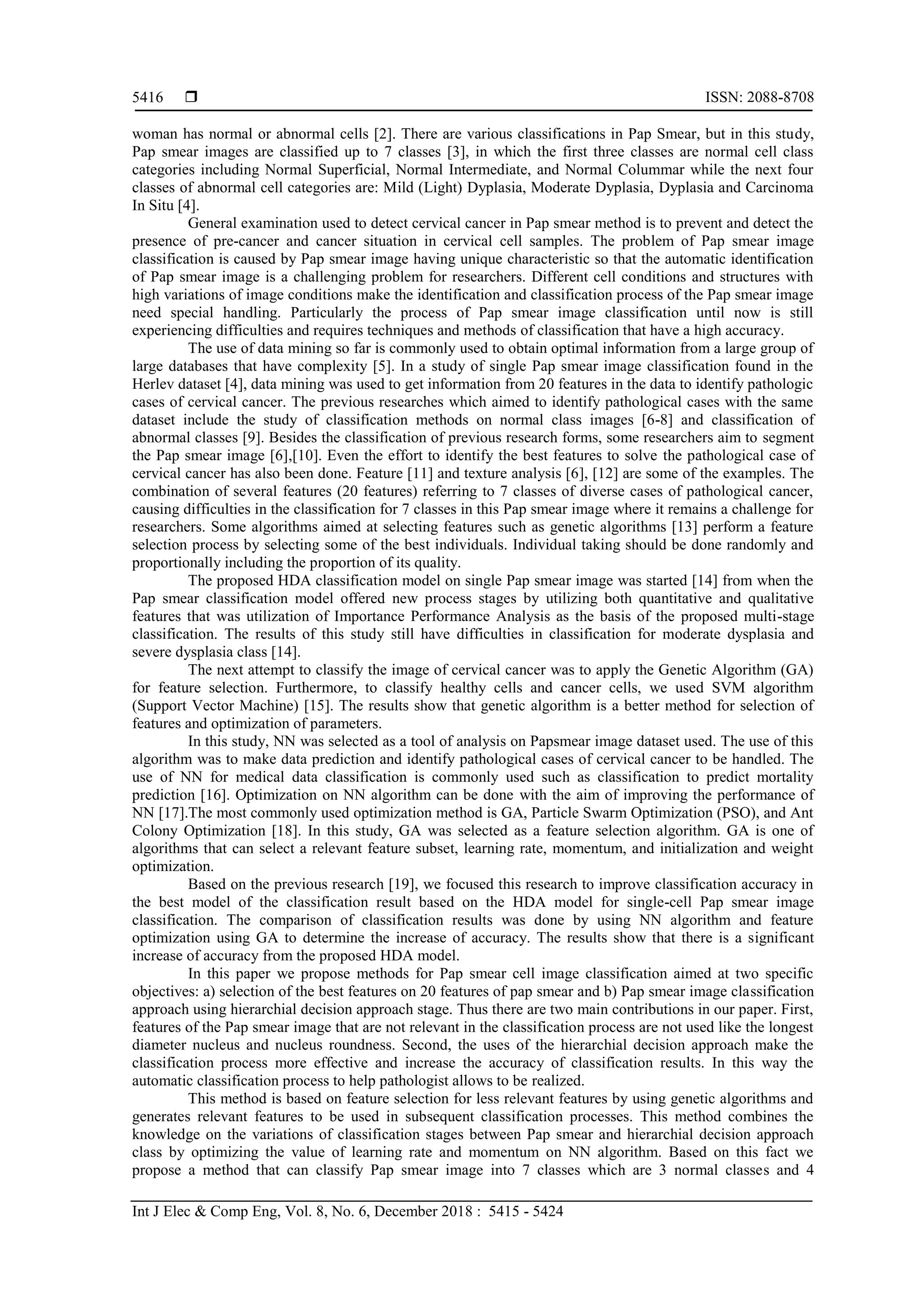The study presents an improved hierarchical decision approach (HDA) for classifying single pap smear images to enhance early cervical cancer detection. By optimizing feature selection using a genetic algorithm and implementing a neural network, the proposed model significantly improves classification accuracy across seven cell categories, including normal and abnormal classes. The research utilized the Herlev dataset with 917 samples, demonstrating the effectiveness of the HDA method in addressing classification challenges in pap smear imaging.