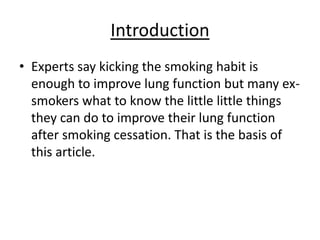 This document discusses ways to improve lung function after quitting smoking. It finds that lung function can improve by over 15% within 8 weeks of stopping smoking. Regular exercise, deep breathing exercises, a healthy diet with vitamins C and E, and avoiding smoke-filled environments can further help lung recovery over time. The lungs will gradually heal and repair themselves after quitting, though it may take over a year to fully recover lung capacity to levels of a non-smoker.