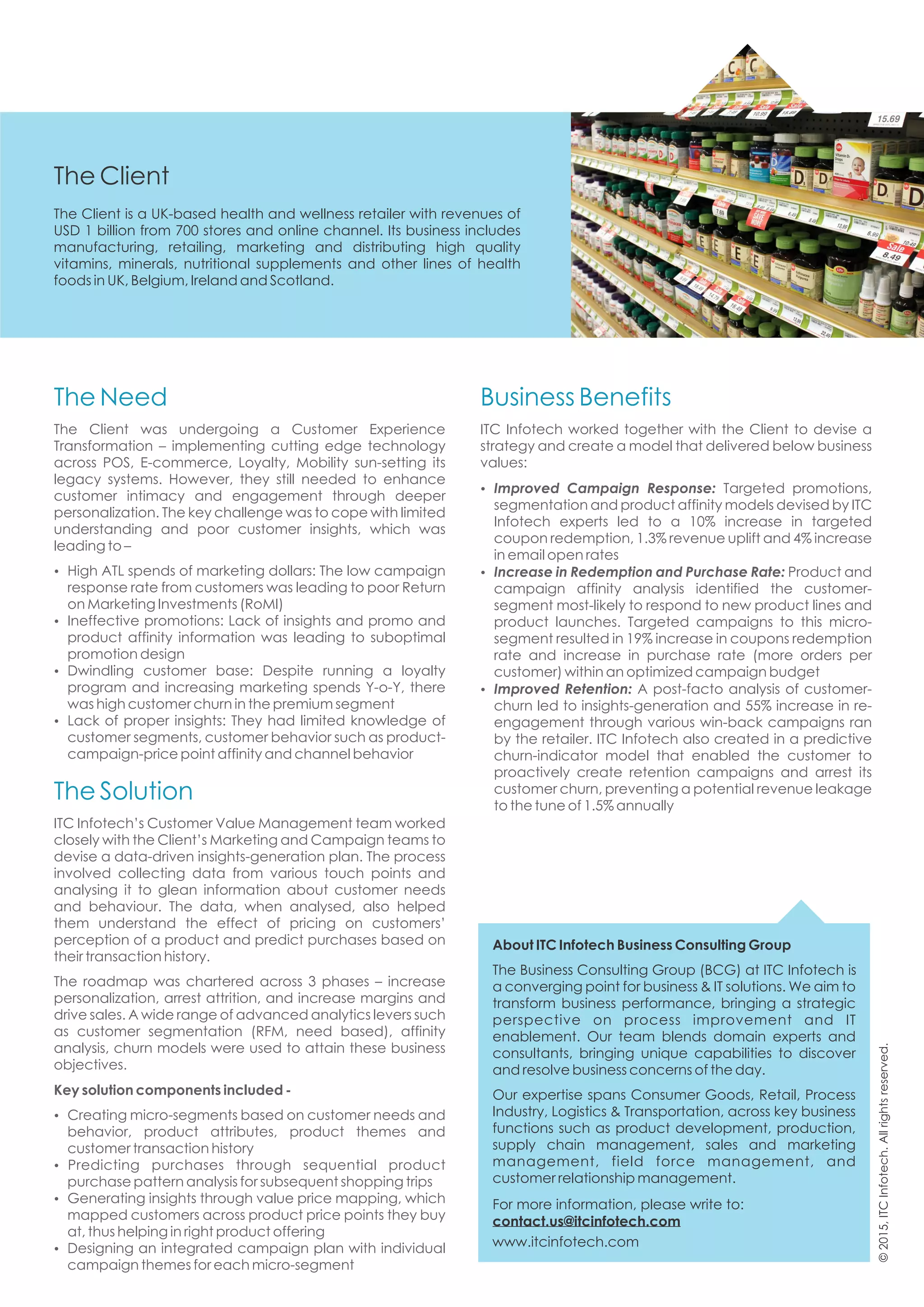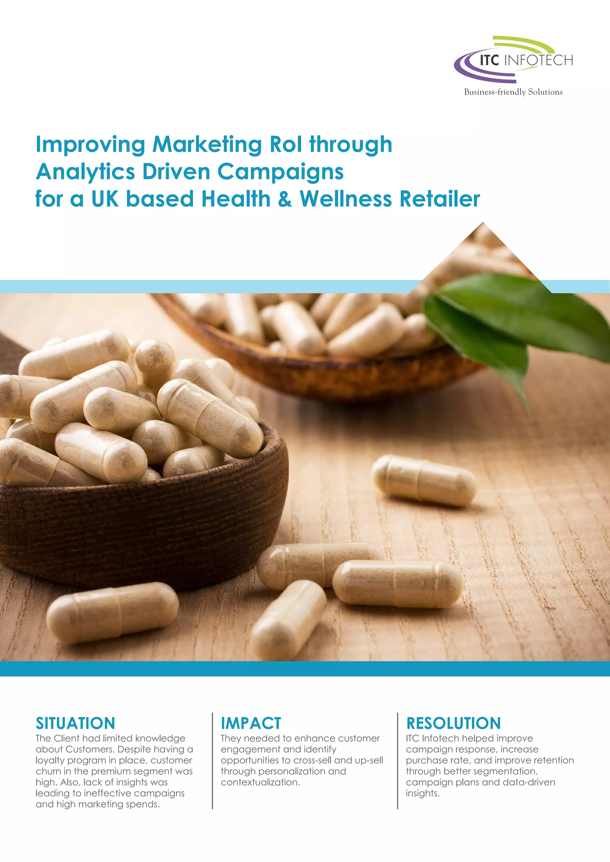 The UK-based health and wellness retailer faced high customer churn, ineffective marketing campaigns, and poor returns on marketing investments due to a lack of customer insights. ITC Infotech helped improve campaign response, increase sales, and boost customer retention by developing advanced analytics solutions to better segment customers and design targeted, data-driven marketing campaigns. These solutions analyzed customer transaction data to understand behaviors and identify at-risk customers, enabling personalized promotions and reducing churn. As a result, campaign redemption and purchase rates increased by up to 19% while arresting over 1.5% in potential annual revenue loss.