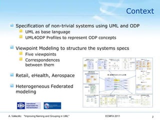 The document discusses improvements in naming and grouping within UML, emphasizing the limitations of the existing UML package structure, such as hierarchical constraints and challenges with name clashes. It proposes a more flexible grouping and naming schema, allowing elements to belong to multiple groups and possess different names in various contexts. The suggested changes aim to enhance usability and address issues with import and merge operations, while still being largely compatible with existing UML standards.