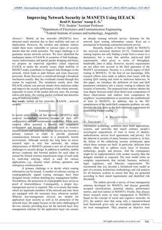 This document discusses improving network security in mobile ad hoc networks (MANETs) using an improved version of the EAACK intrusion detection system called IEEACK. IEEACK aims to address some of the weaknesses of EAACK related to link breakage, malicious sources, and partial packet dropping. The document describes the components of IEEACK, including ACK, S-ACK, MRA, digital signatures, and a new trust-based quality of service model. Simulation results show that IEEACK can prevent attacks from malicious nodes and improve security performance metrics like packet delivery ratio and detection of malicious nodes.