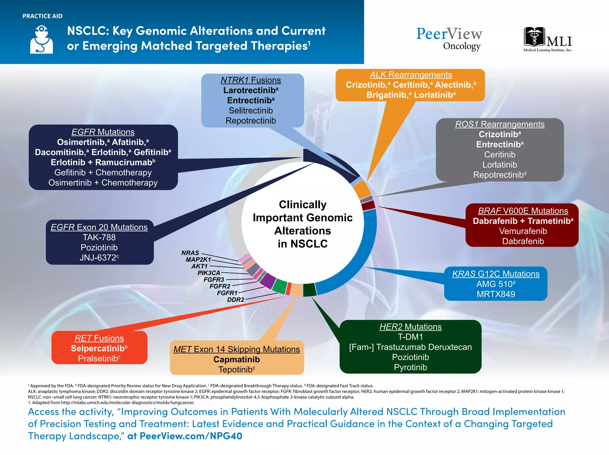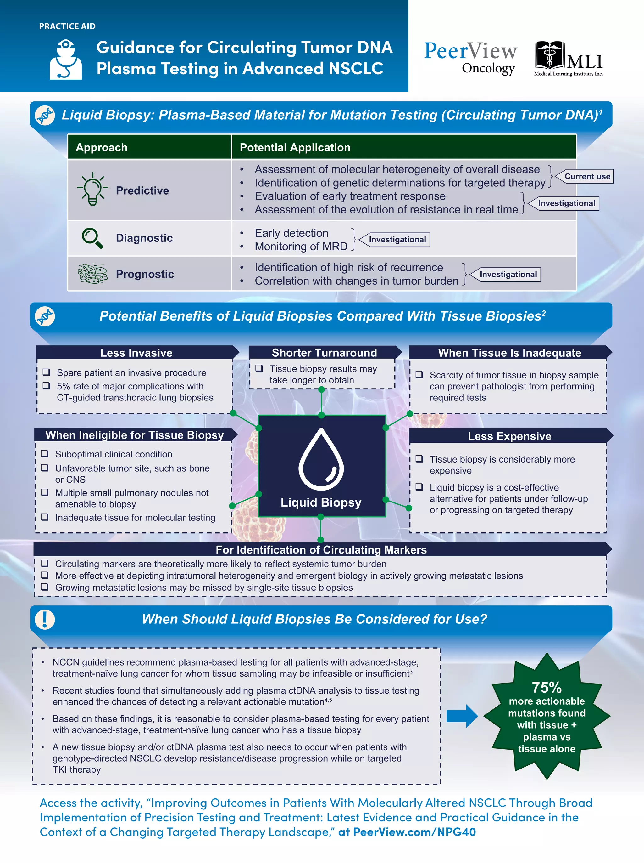 The document outlines key genomic alterations in non-small cell lung cancer (NSCLC) and their associated targeted therapies, highlighting FDA-approved options and the importance of molecular testing. It emphasizes the role of circulating tumor DNA (ctDNA) in liquid biopsies as a cost-effective alternative to tissue biopsies for monitoring treatment response and detecting mutations. Recommendations for molecular testing techniques and the necessity of testing all patients with stage IV NSCLC as quickly as possible are also provided.
