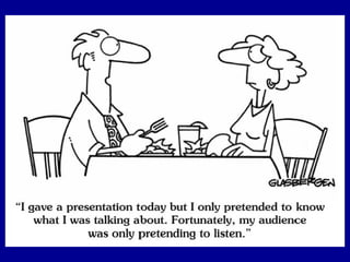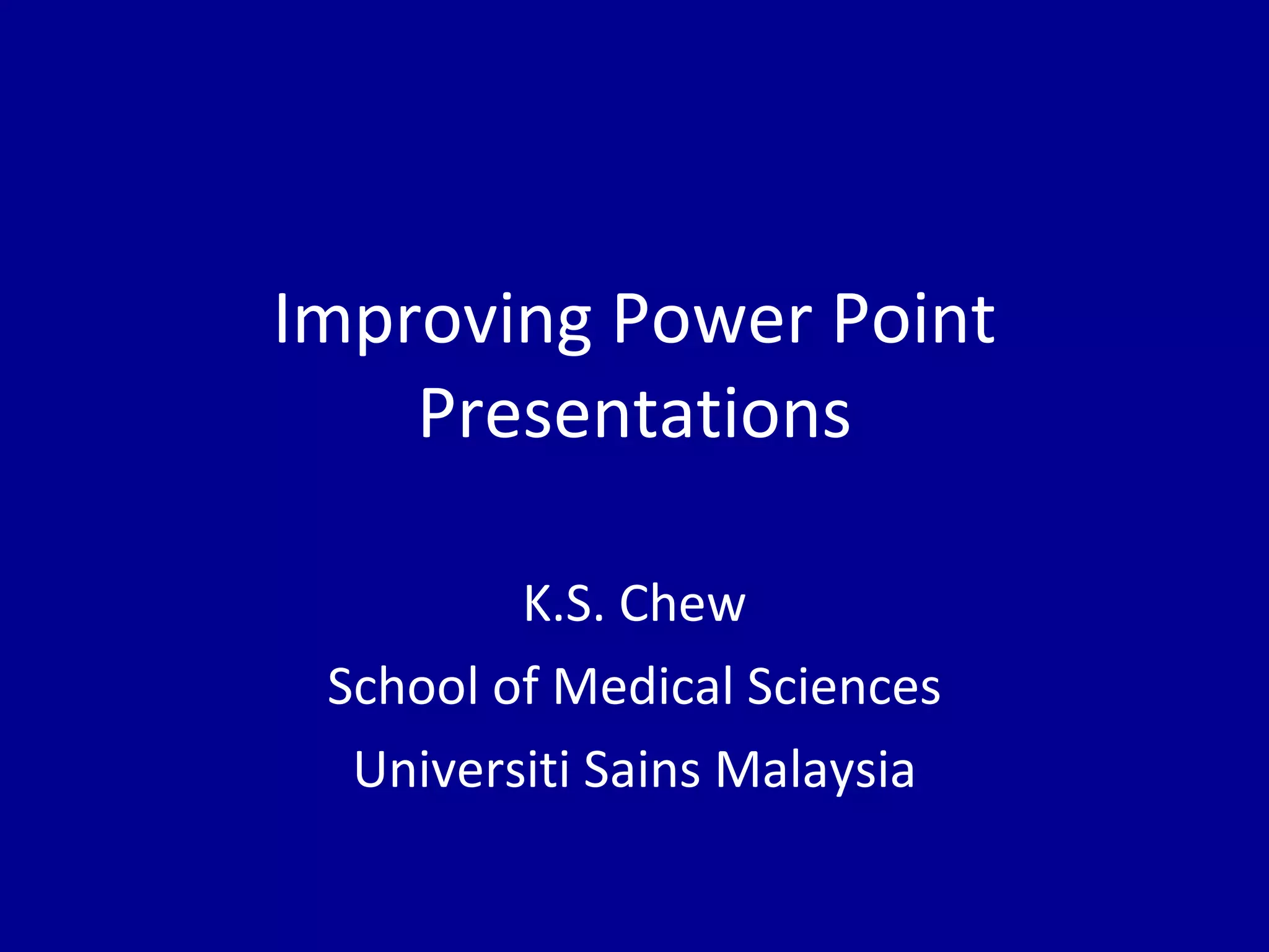 The document discusses the common issues with PowerPoint presentations, highlighting the importance of clear communication between the presenter and audience. It suggests three key rules for creating effective slides: keeping slides simple (the K.I.S.S. principle), limiting the number of slides, and using appropriate fonts and colors. Additionally, it emphasizes careful planning to enhance audience engagement and comprehension.