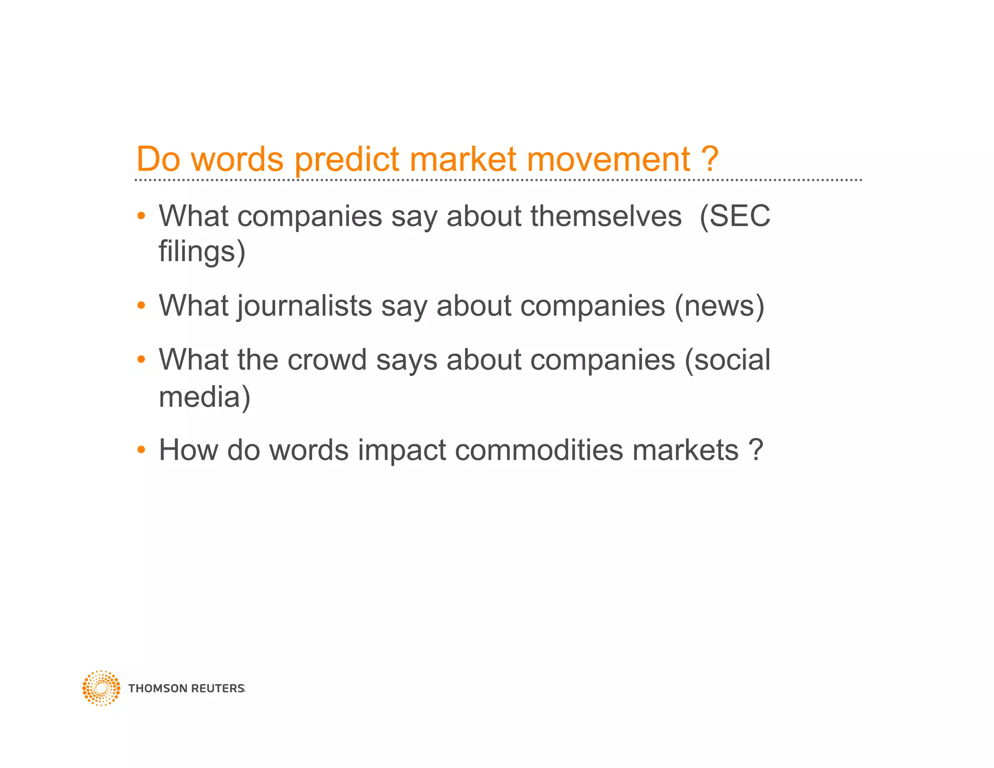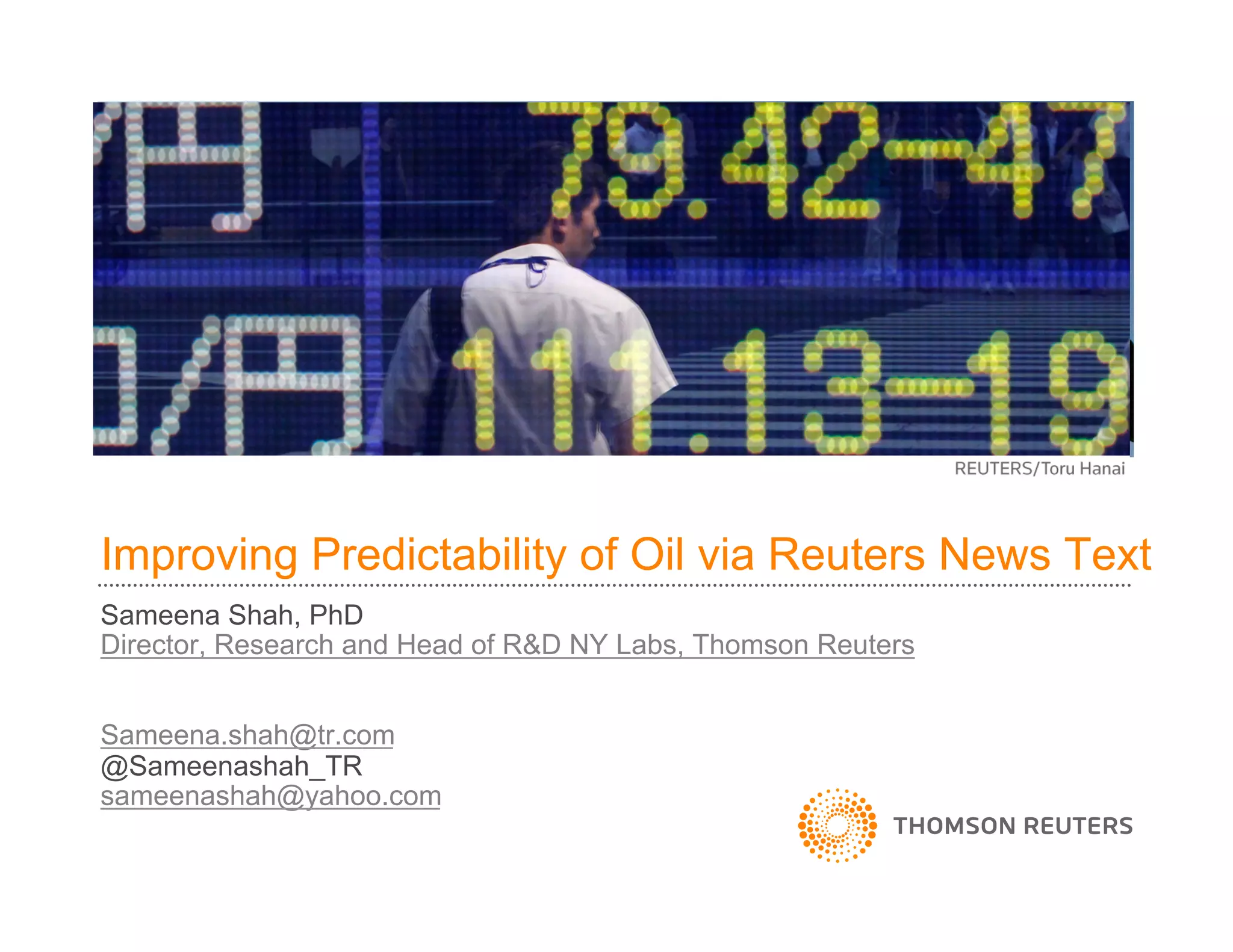 The document discusses a research approach by Sameena Shah, focused on how textual data from news articles can predict oil market movements and volatility, moving beyond traditional quantitative measures. It highlights the use of latent Dirichlet allocation for topic modeling and how filtering and dimensionality reduction can improve predictive accuracy. By comparing a news-based model to baseline models, it concludes that the news-based approach provides enhanced predictability for oil price movements.