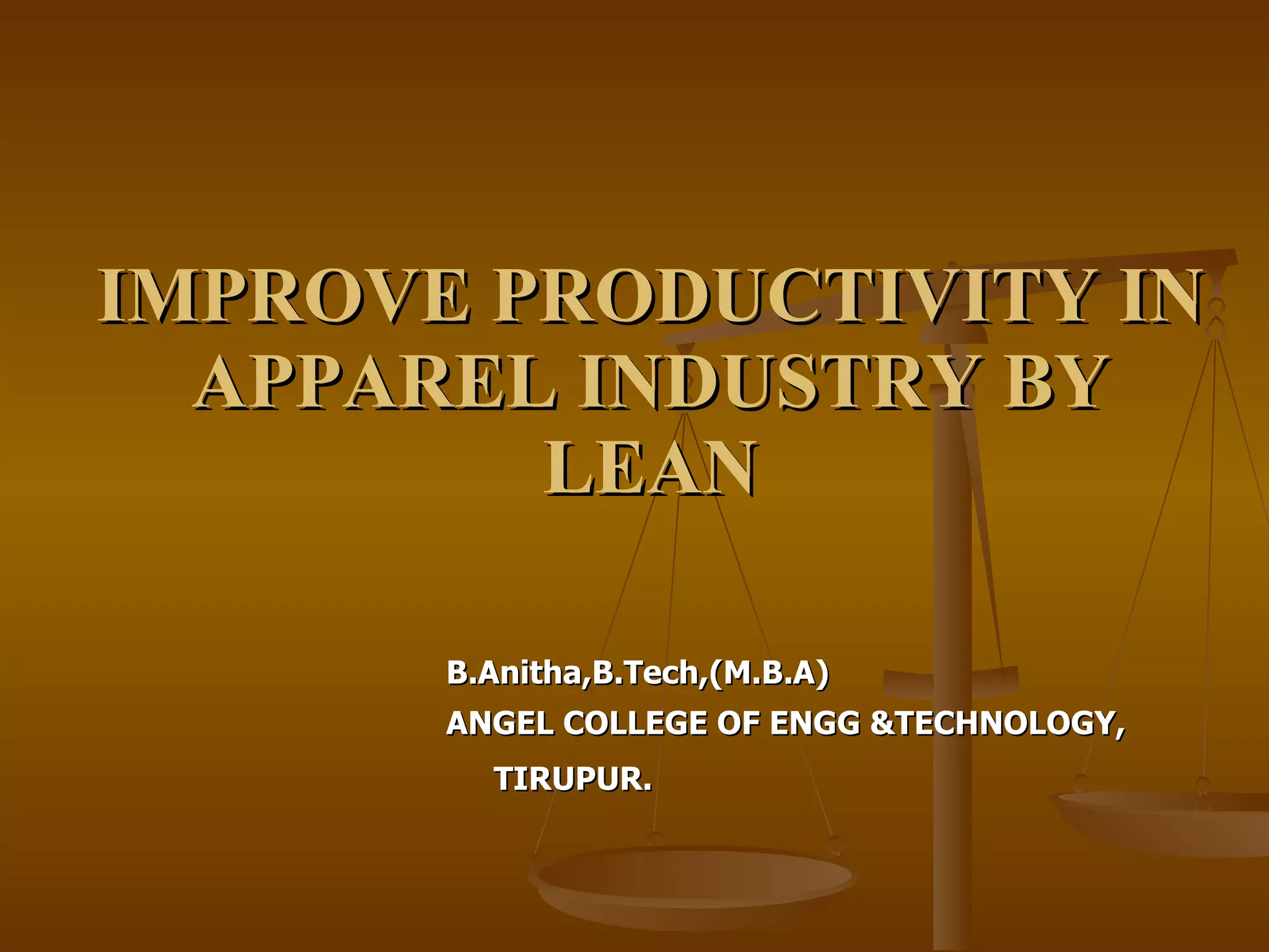 The document discusses the implementation of lean manufacturing in the Indian apparel industry to enhance productivity while minimizing waste. It outlines the challenges faced, strategies employed, and results after focusing on critical areas such as overproduction, defects, and waiting times, highlighting significant improvements in productivity and quality without additional investments. The findings recommend continuous adherence to lean principles like the traffic light system and 5S housekeeping to sustain these gains.